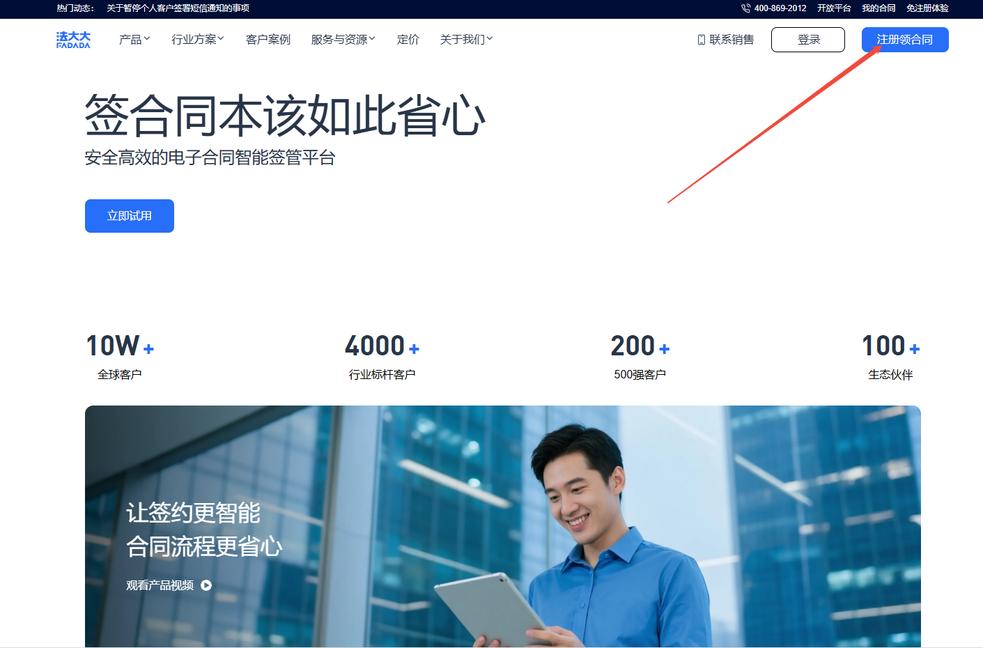 通过浏览器输入法大大官网门户的地址:https://www.fadada.com。点击右上角【立即注册】。