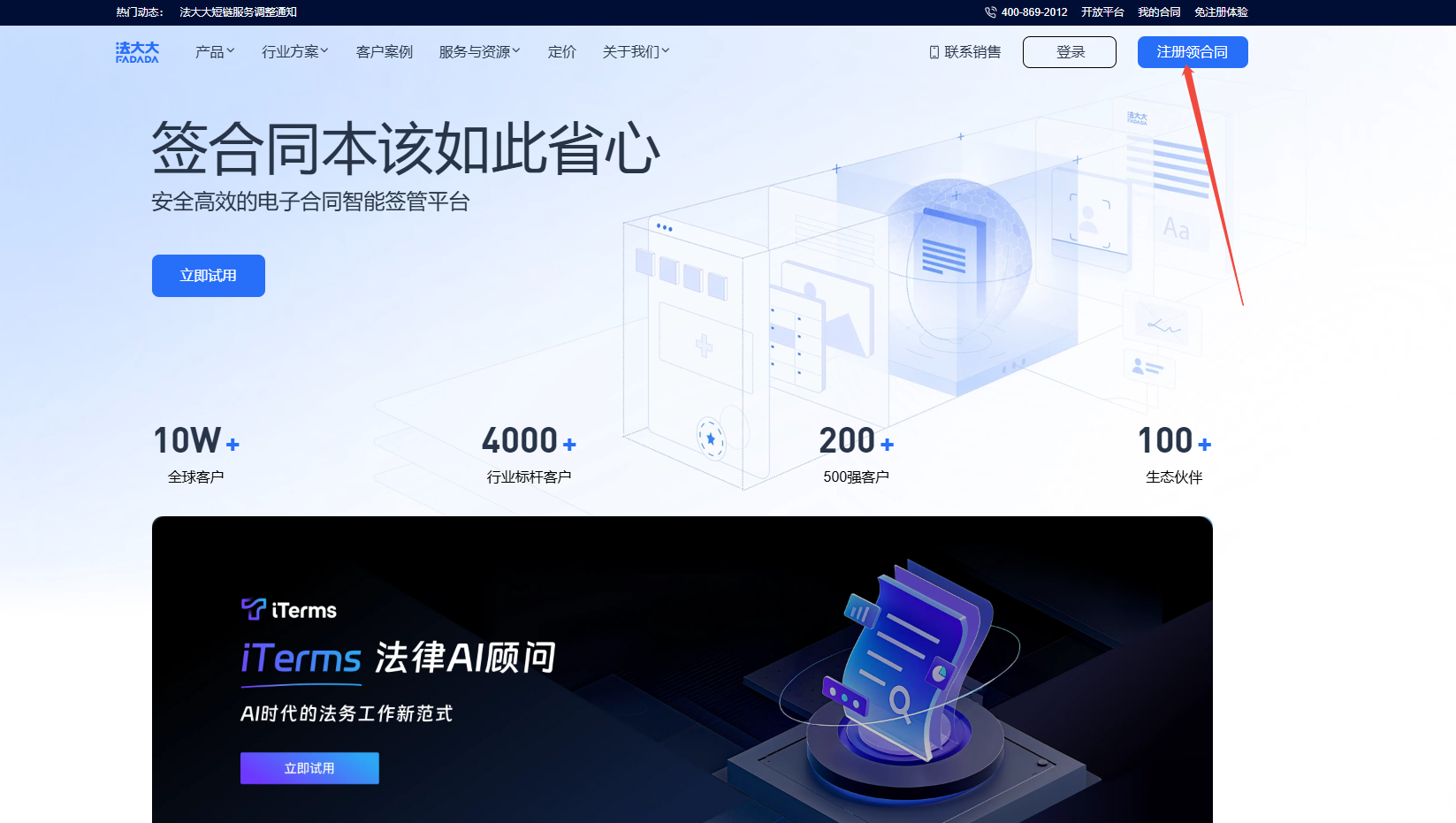 1、通过浏览器输入法大大官网门户的地址:https://www.fadada.com/。点击右上角【注册领合同】。