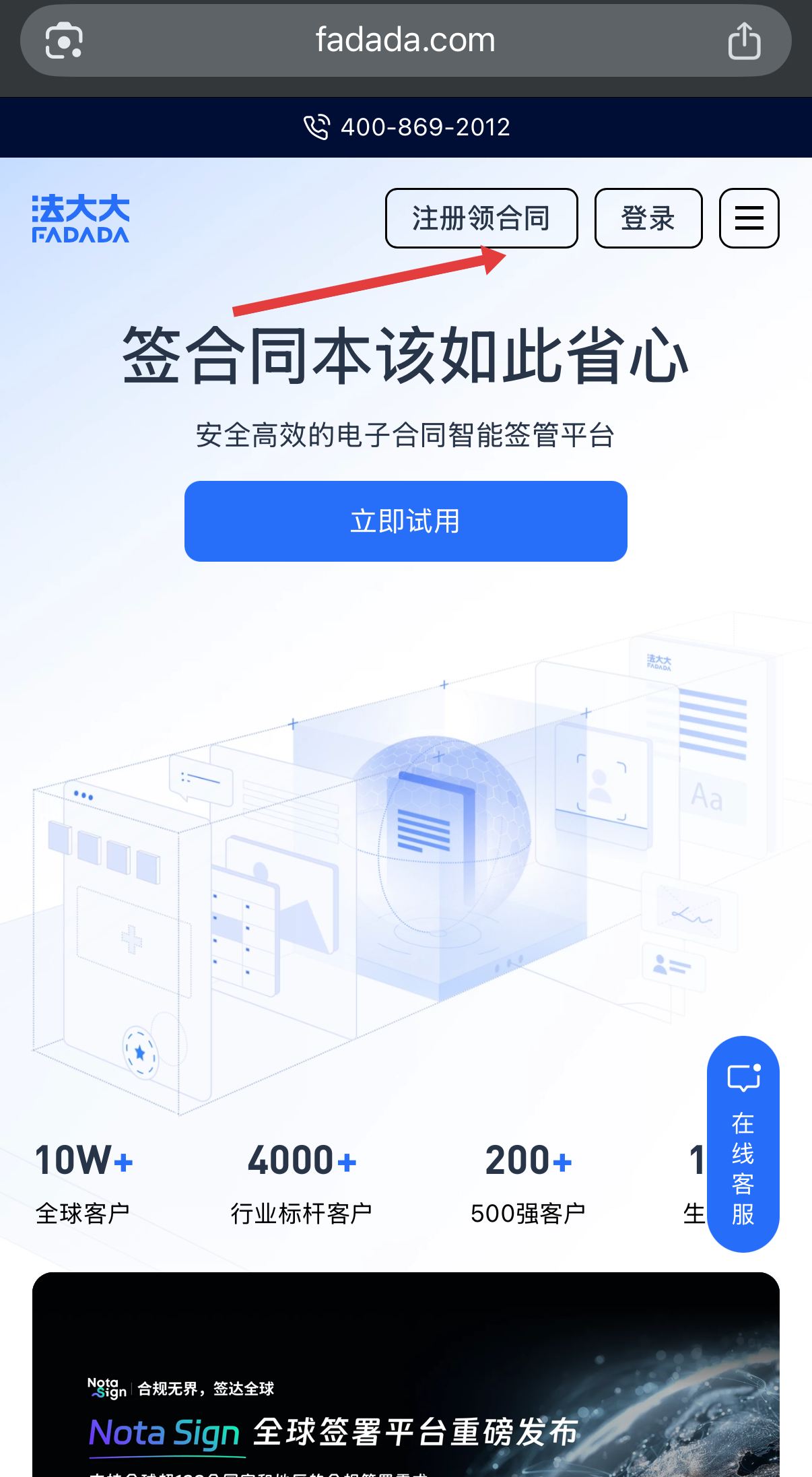 移动端也通过浏览器输入法大大官网门户的地址:https://www.fadada.com/后,点击右上角【立即注册】。