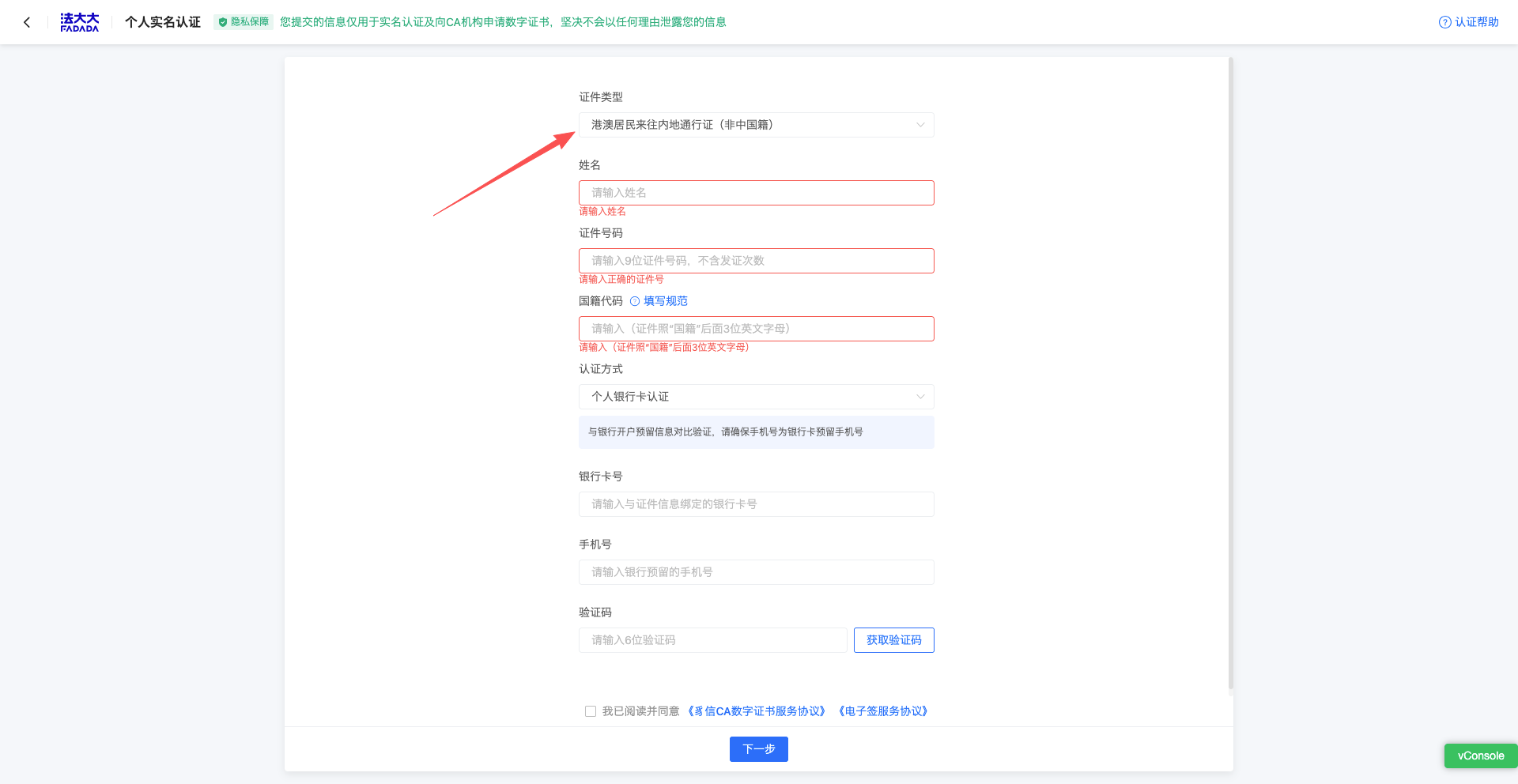 在认证页面,选择证件类型,目前支持中国居民身份证、港澳居民居住证、台湾居民居住证、外国人永久居留身份证、港澳居民来往内地通行证、台湾居民来往大陆通行证、护照7种证件类型;填写完相应证件信息后,选择具体的认证方式,并且勾选同意协议
