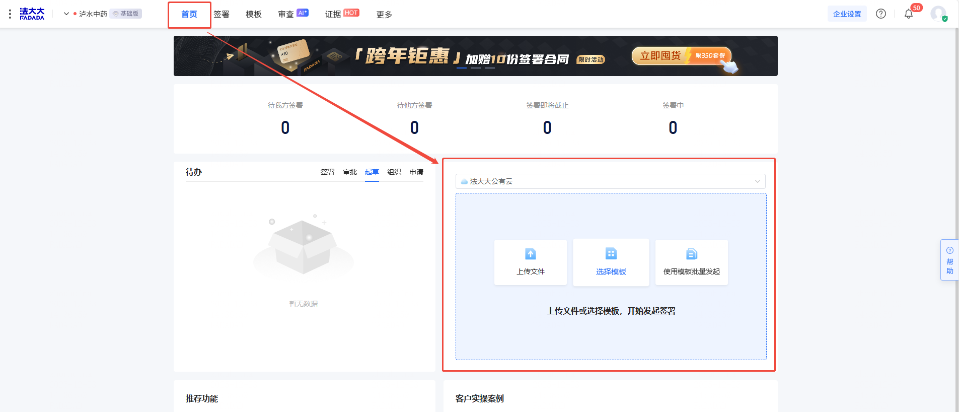 登录法大大工作台,进入首页,点击右上角【上传签署文件】:
