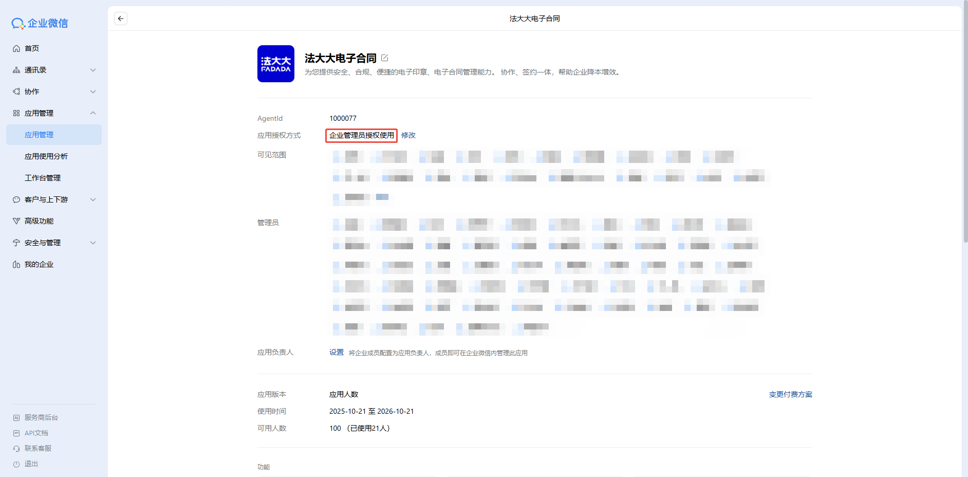 注:应用授权方式需确保选择:【企业管理员授权使用】