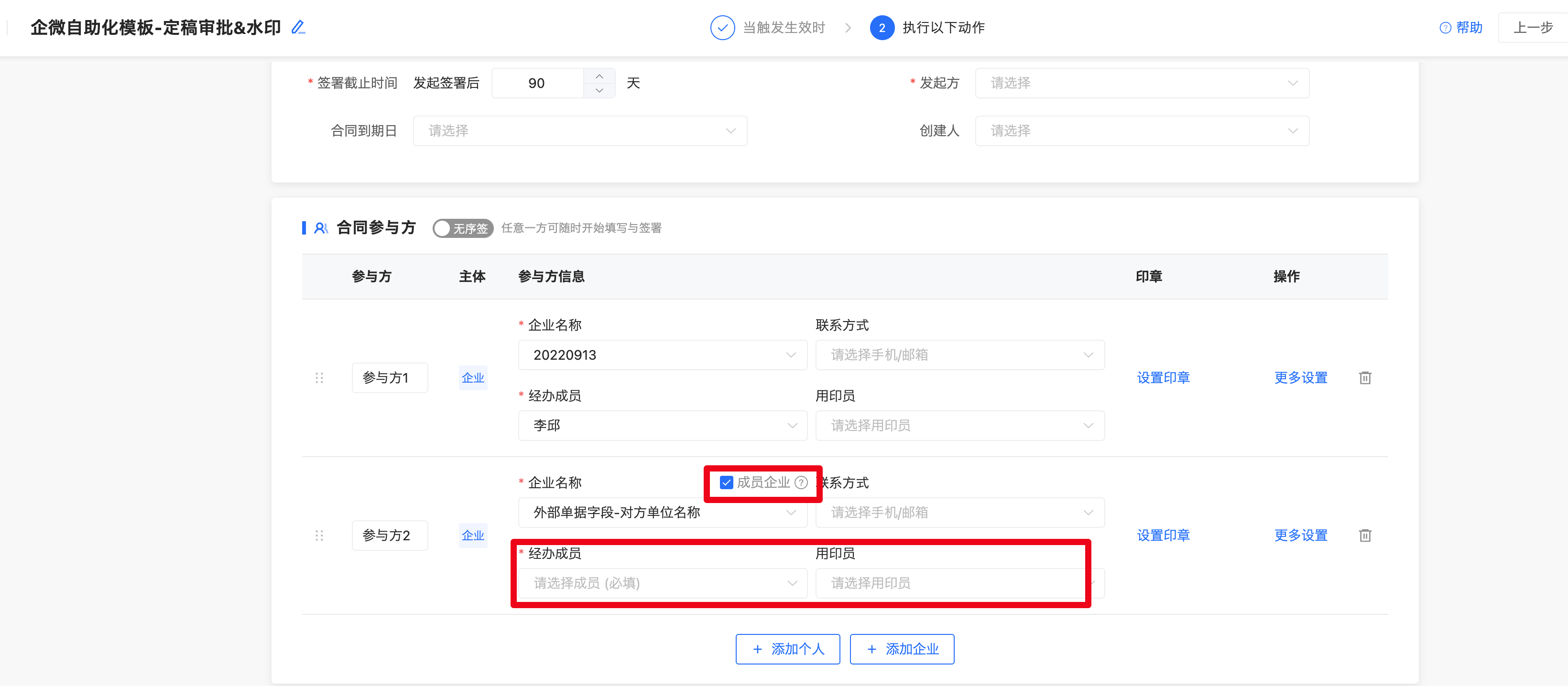 勾选后可像内部成员企业一样选择具体的经办成员和用印员,解决成员企业自动化发起签署,无法提前指定经办成员的情况