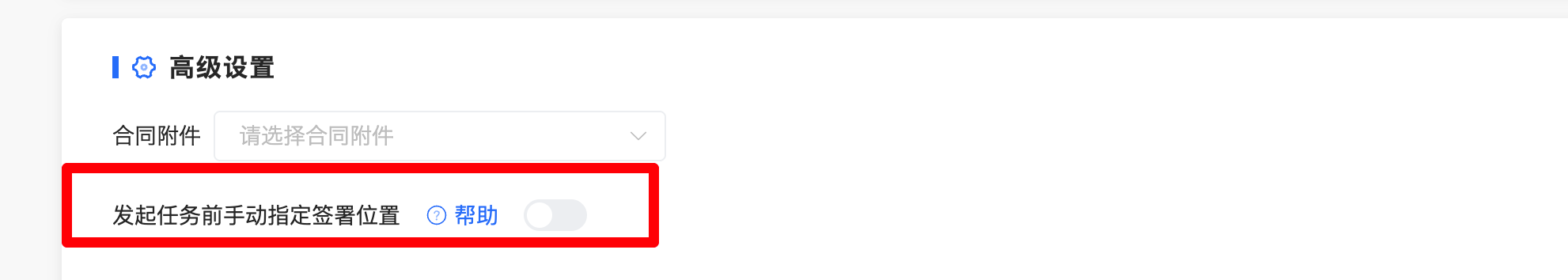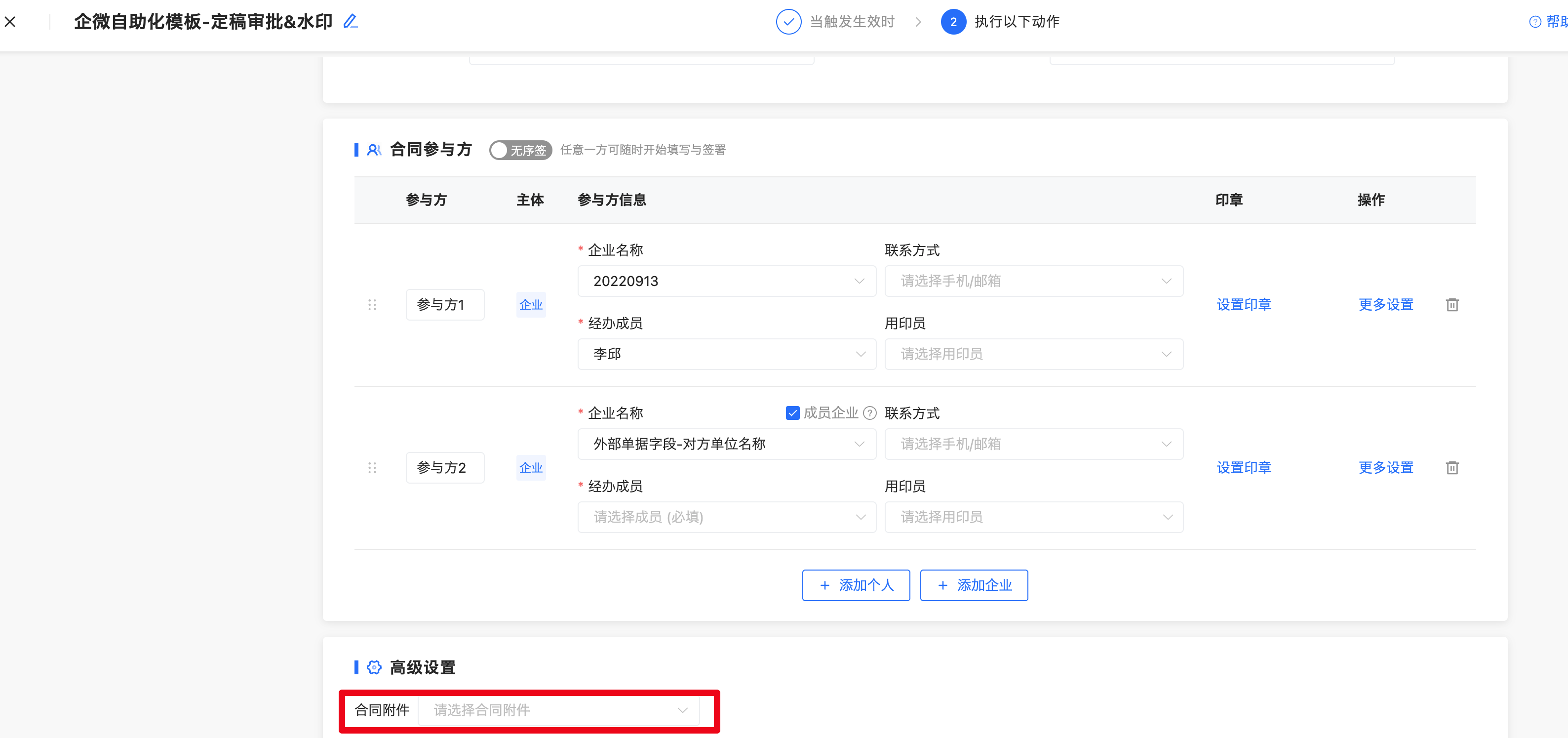 (3)自动化助手,直接发起高级设置增加合同附件,可将外部审批单据中文件作为签署附件
