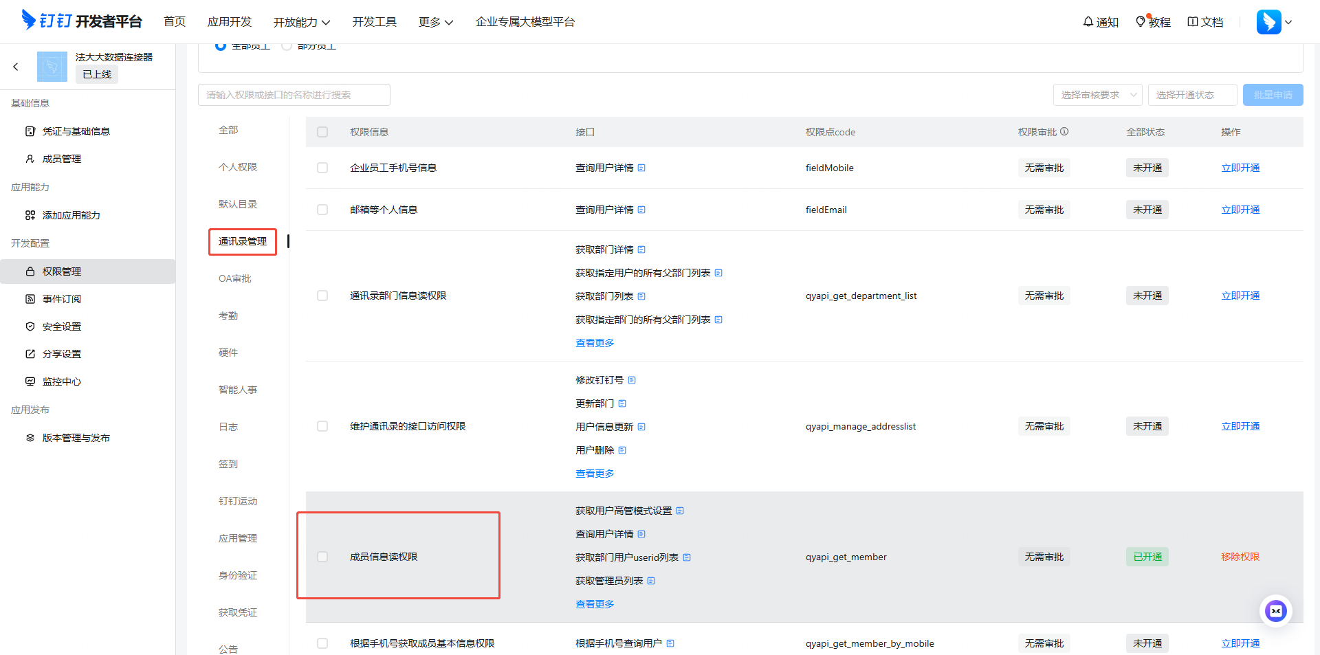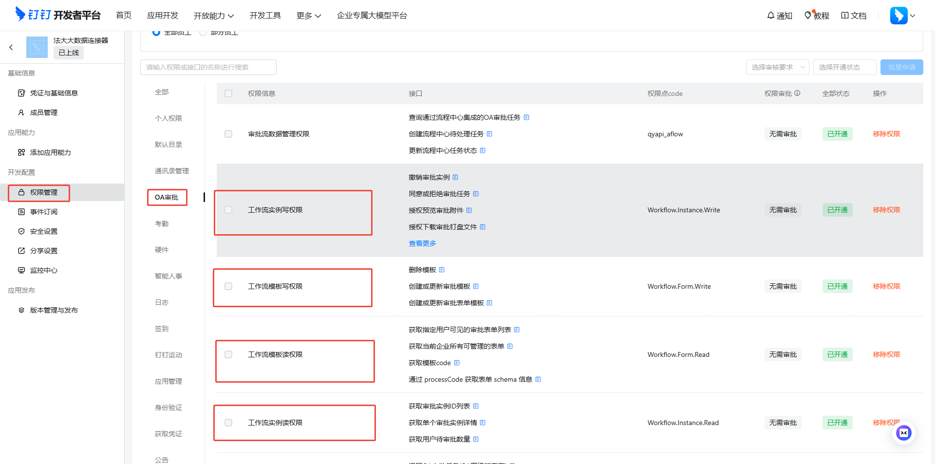 9、进入权限管理。根据实际需要设置权限,例如需要通过钉钉审批发起签署,则设置OA-审批对应的权限。