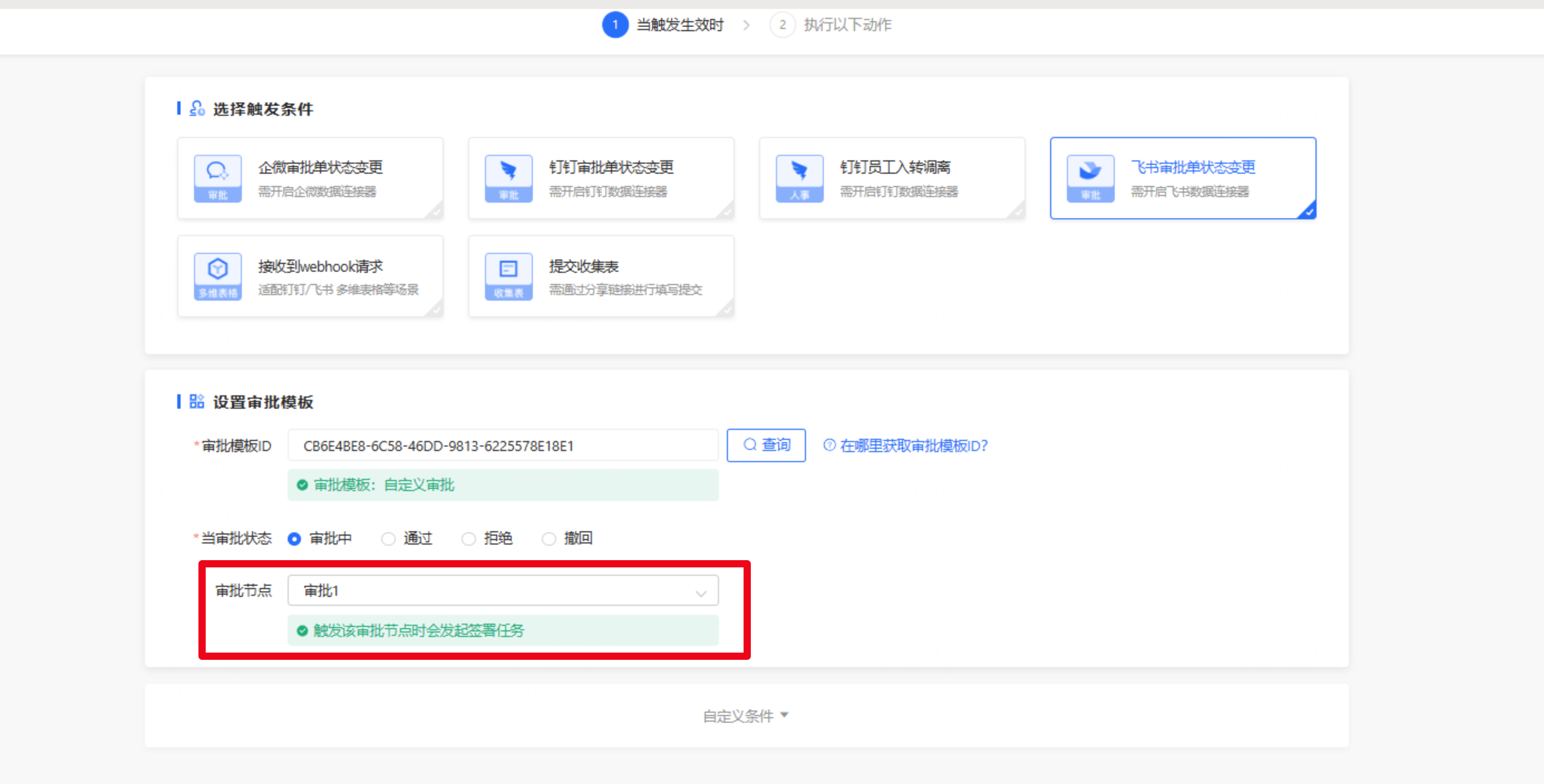 1.3设置状态条件。例如希望飞书审批单通过后触发,就选择【审批结束-已同意】;希望飞书审批单提交后就触发,就选择【审批中】。