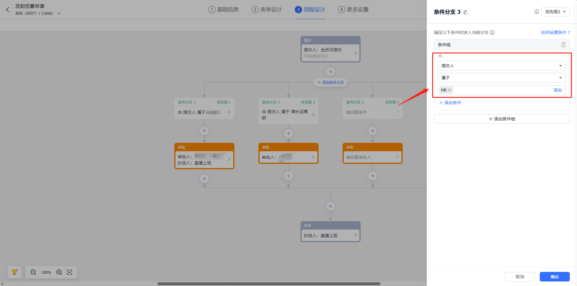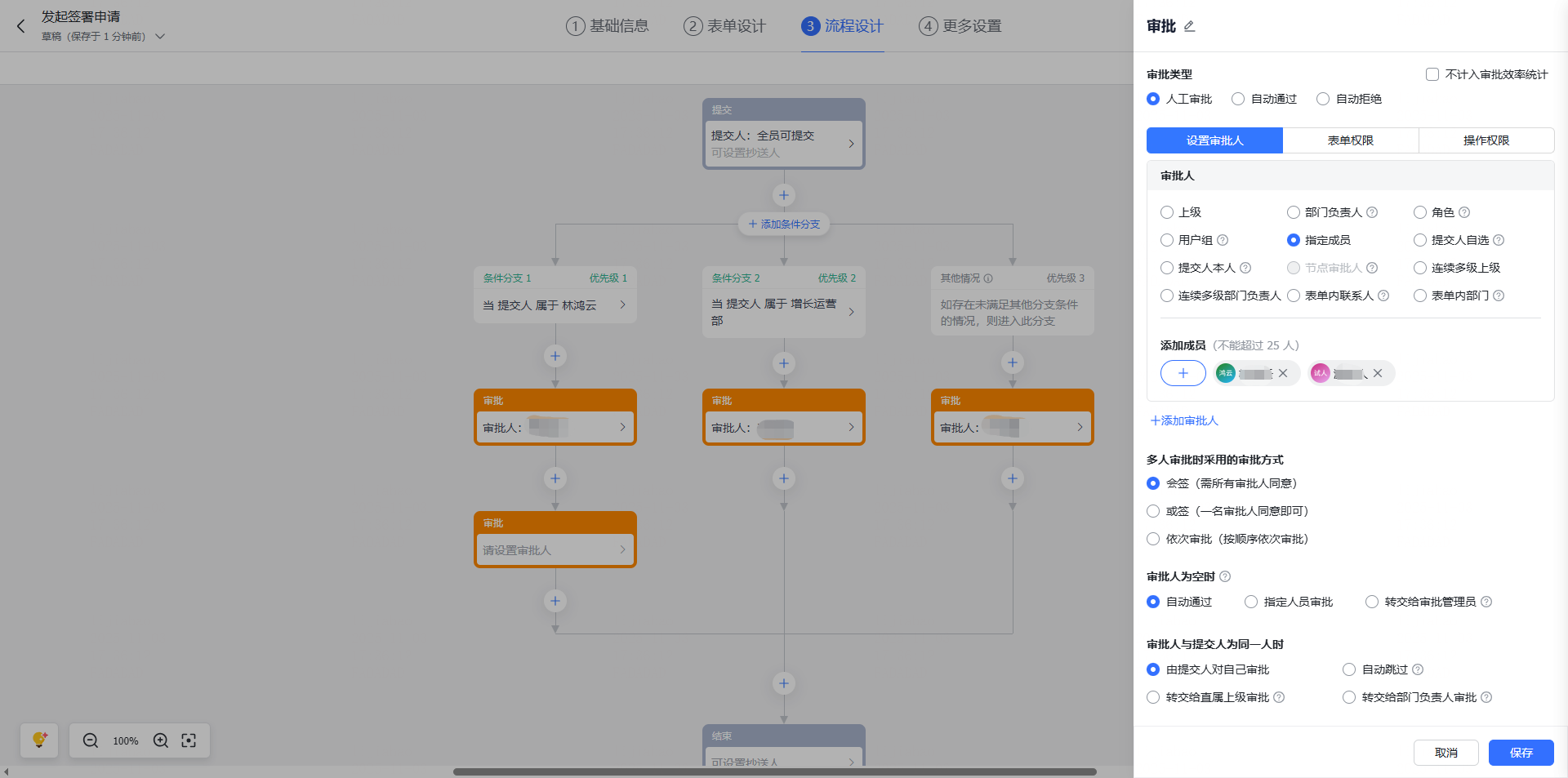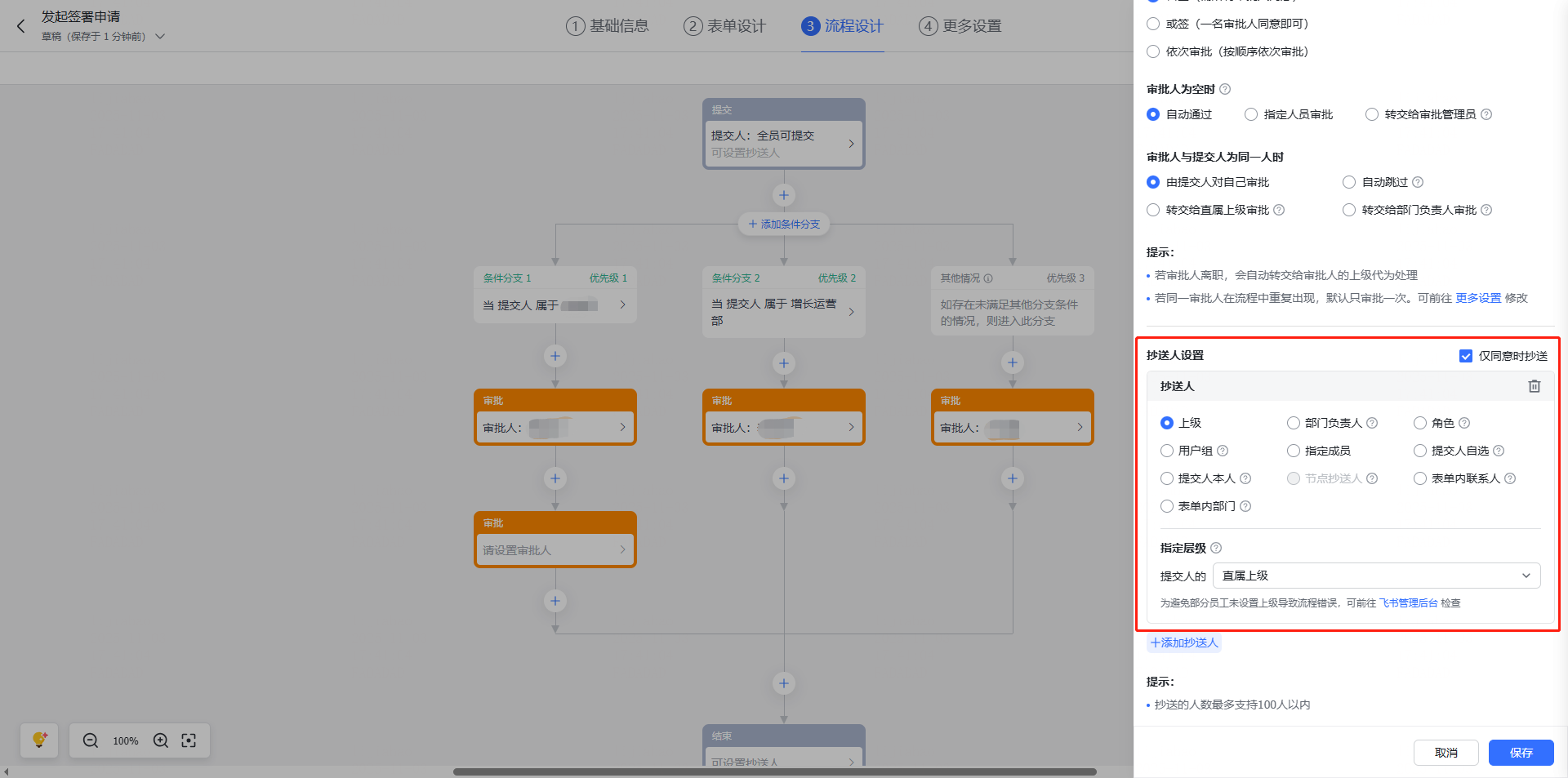 c 条件配置完成后,继续配置该条件分支的审批人和抄送人;