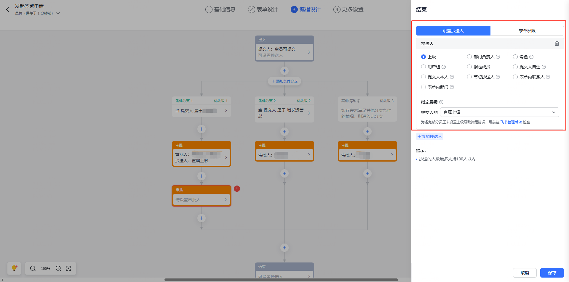 审批节点与结束节点都可设置抄送人:可指定抄送人、提交人自选、提交人本人等