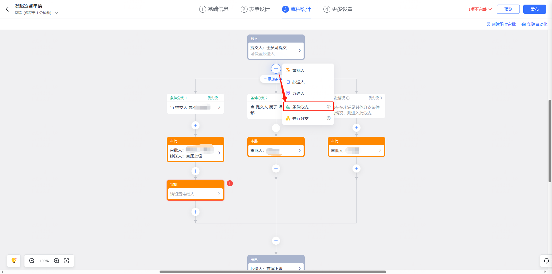 条件分支设置:实景审批场景中遇到一个审批流无法满足的情况可以设置条件分支;例如有多种类型合同发起审批需要不同的人审批,则可以设置条件分支审批