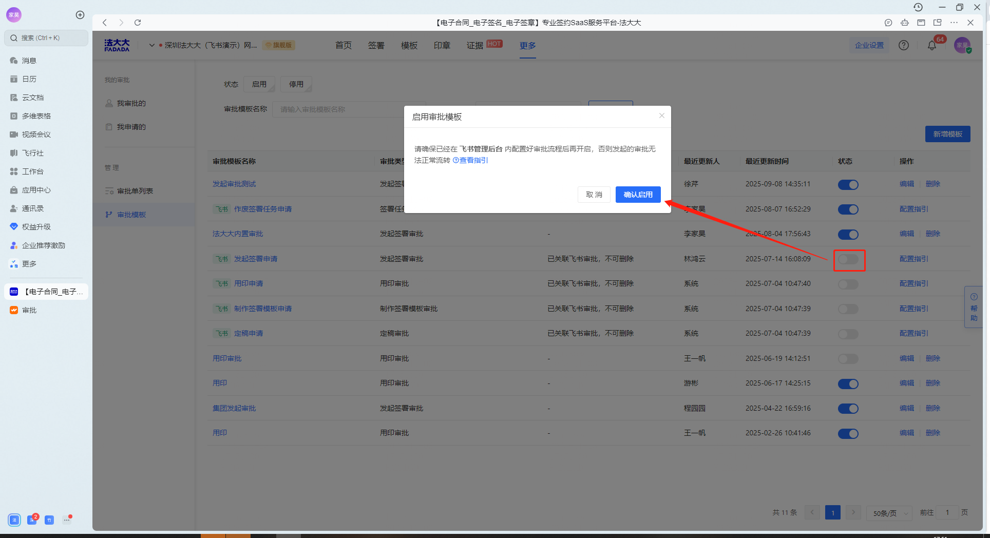 5、完成设置发布后,回到法大大电子签应用,启用对应的飞书审批模板,点击【确认启用】,后续触发相应的业务即可选择对应飞书审批流