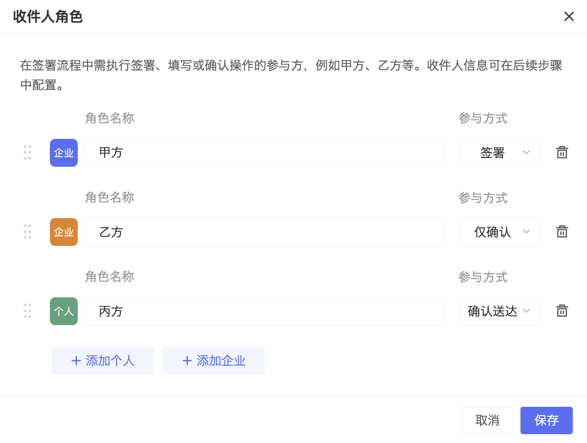 收件人角色参与方式设置,指定了收件人的文件处理方式,包括: