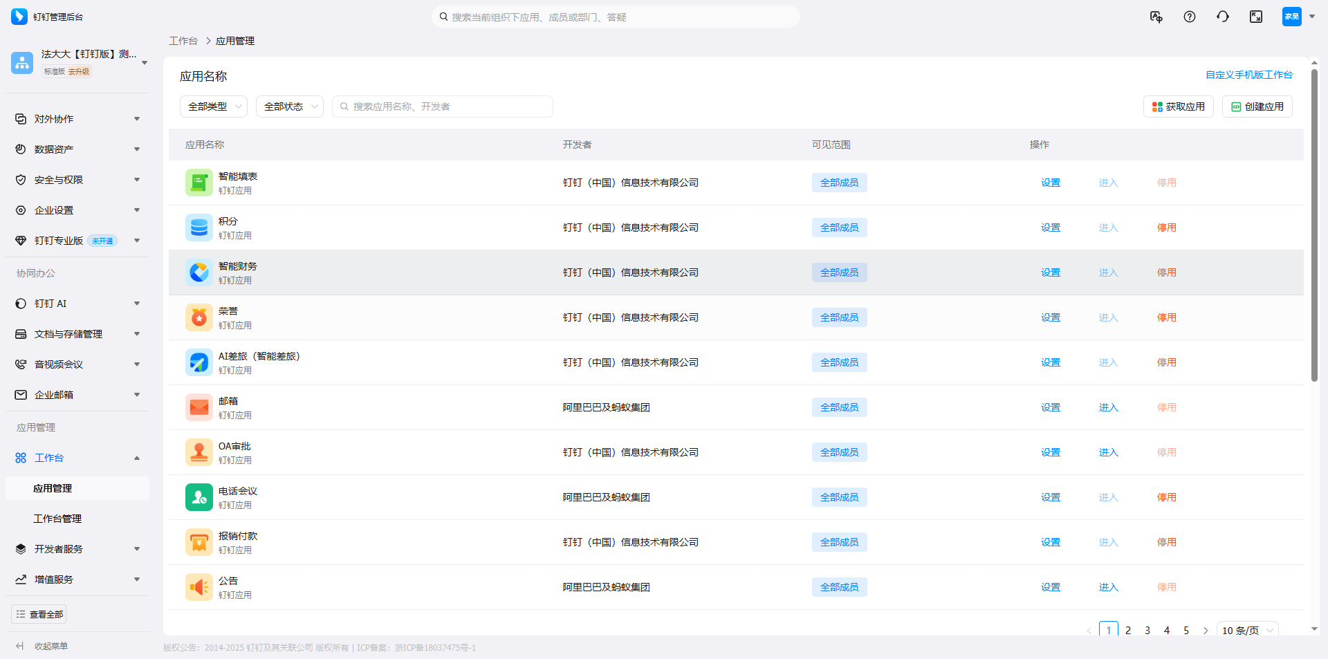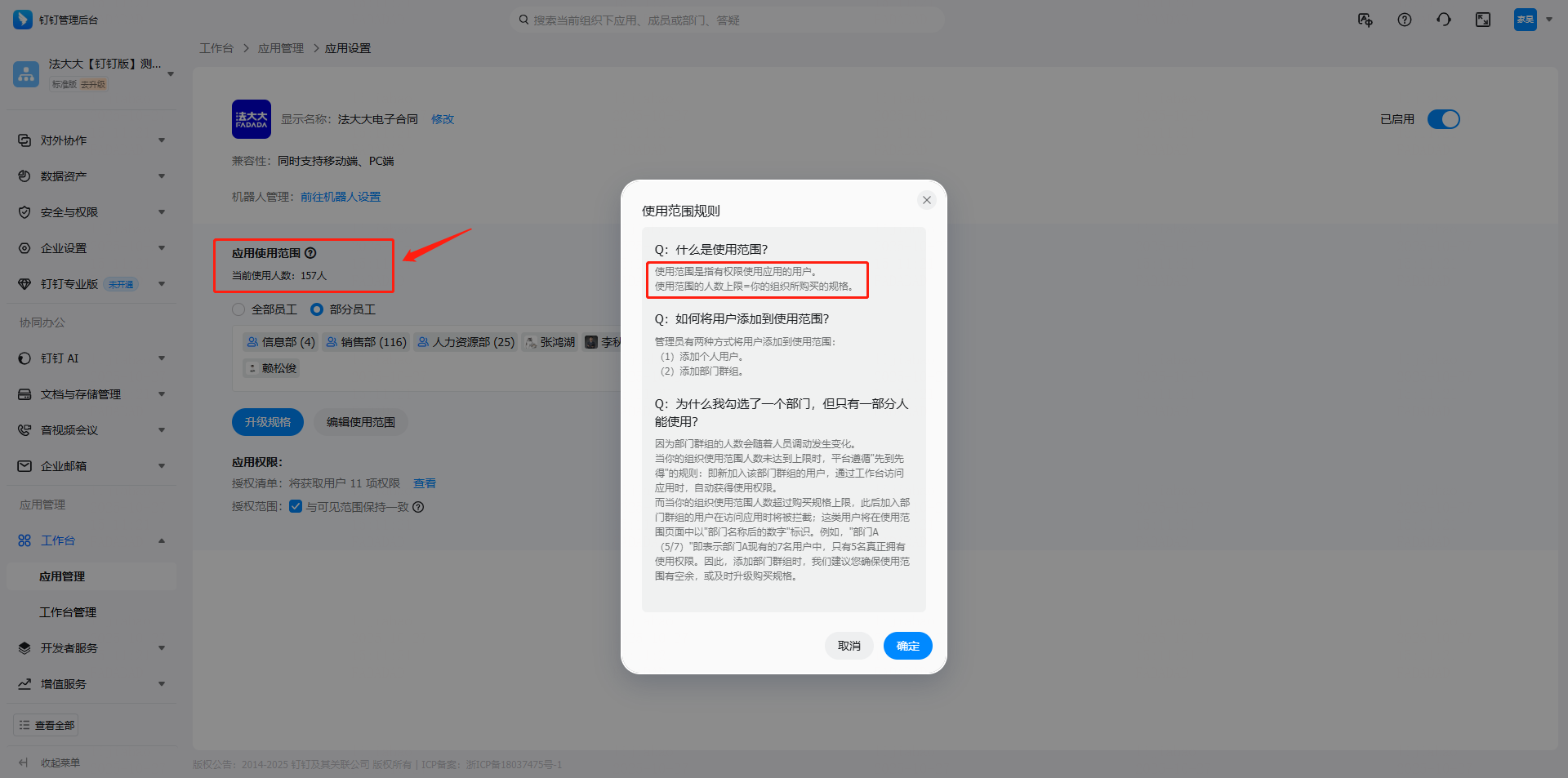 注:如果选择应用使用范围是【全部员工】 则当前使用人数 等于 钉钉企业中通讯录全部成员数