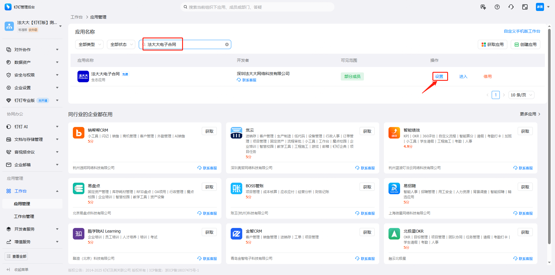 搜索【法大大电子合同】应用,点击【设置】