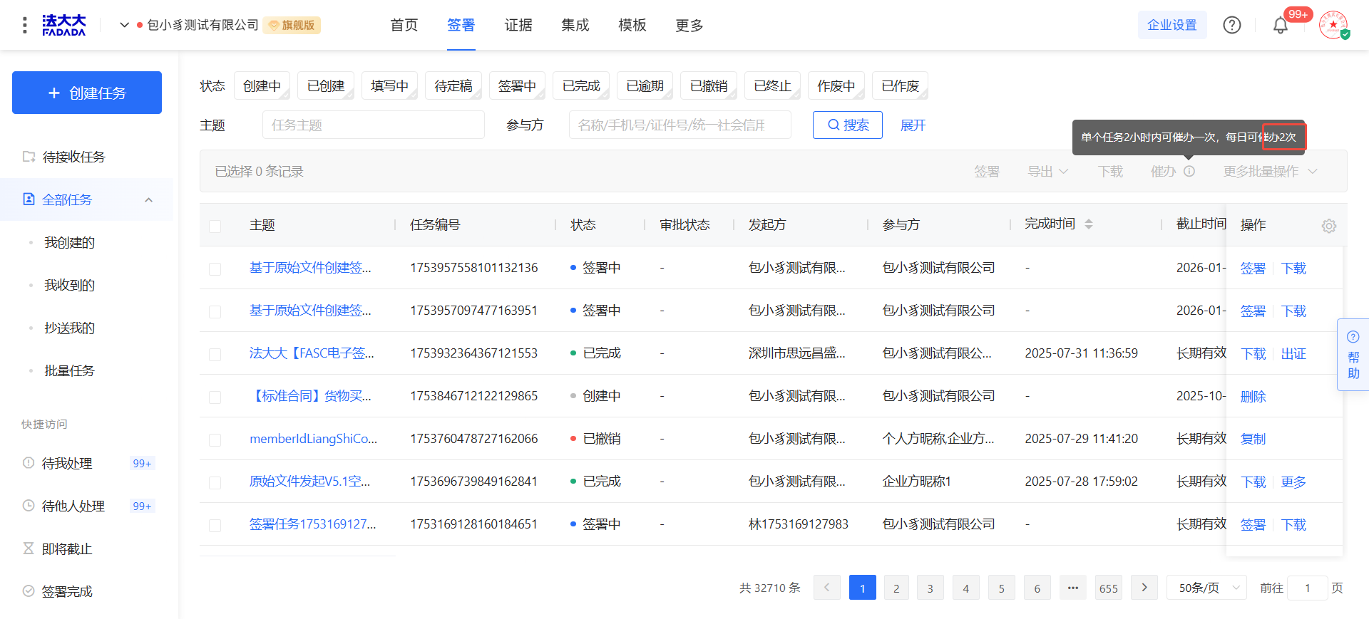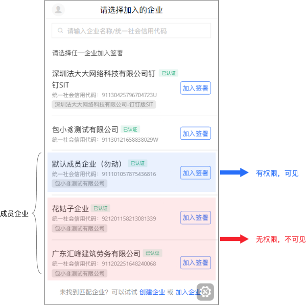 (3) 优化后影响范围:企业员工接收外部合同,且合同需要手动选择企业接收时,原来可以随意选择账号下的成员企业加入签署,现在只能选择有权限的成员企业加入。