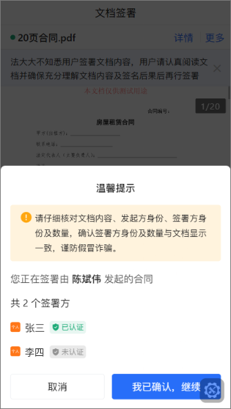 因近期较多诈骗事件,均来自个人发起方发送给个人,现针对个人发给个人签署的任务,在提交签署前让用户确认发方、签约方的基本信息,避免个人仅通过合同内容的迷惑性内容,被不法分子诈骗。