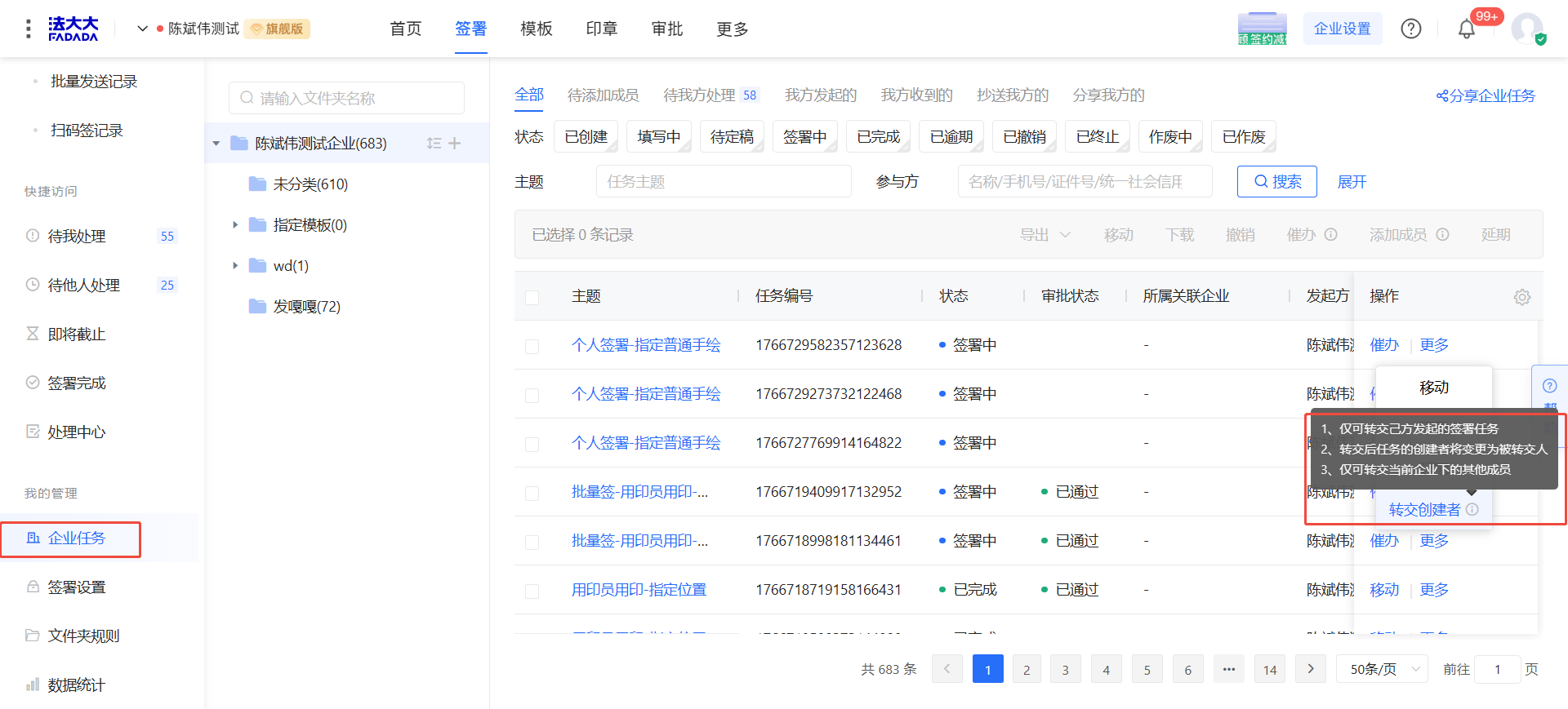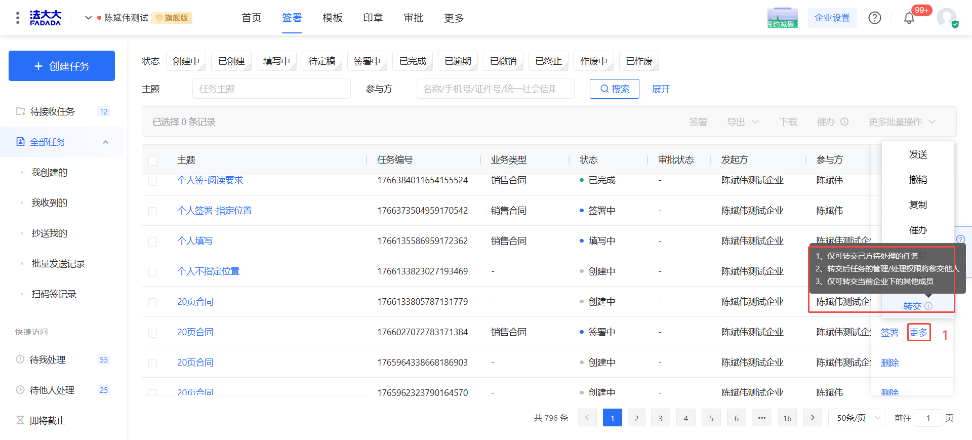 (1)全部任务-支持经办人转交任务处理权限,可设置转交后经办人是否保留查看权限。转交后将任务的处理权限转交给指定企业成员