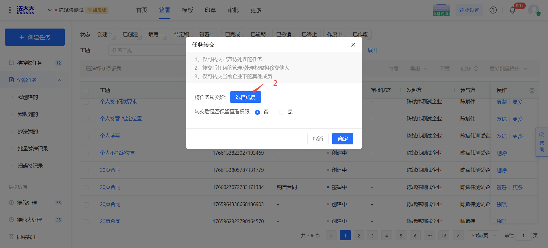 (1)全部任务-支持经办人转交任务处理权限,可设置转交后经办人是否保留查看权限。转交后将任务的处理权限转交给指定企业成员