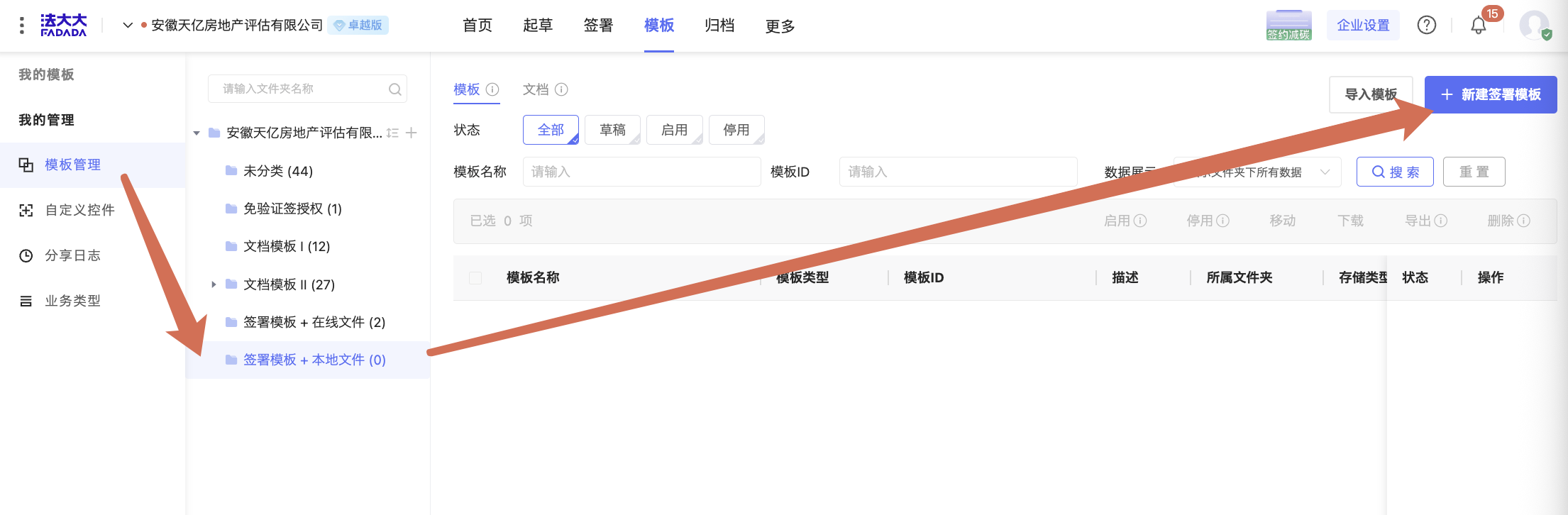 1、进入模板应用页签,我的管理 - 模板管理,点击「新建签署模板」: