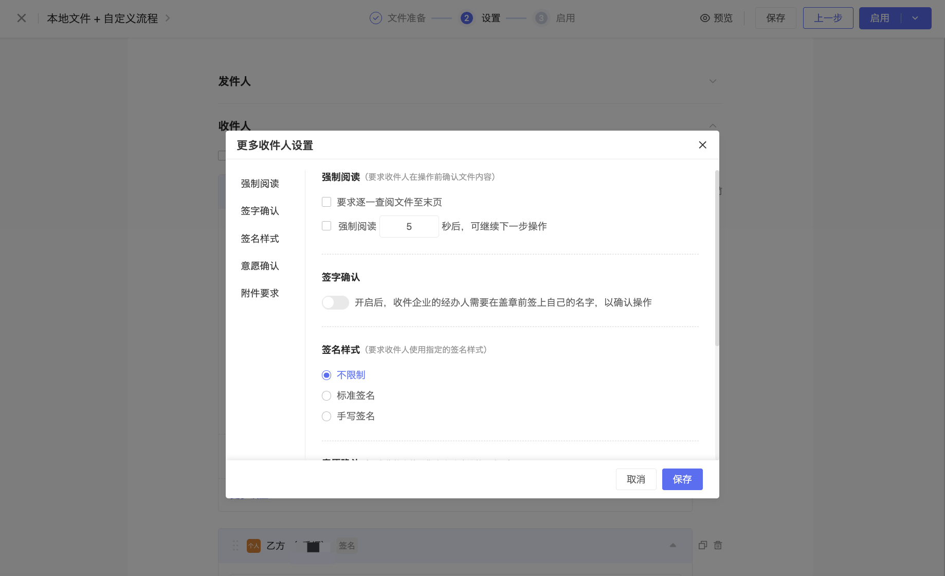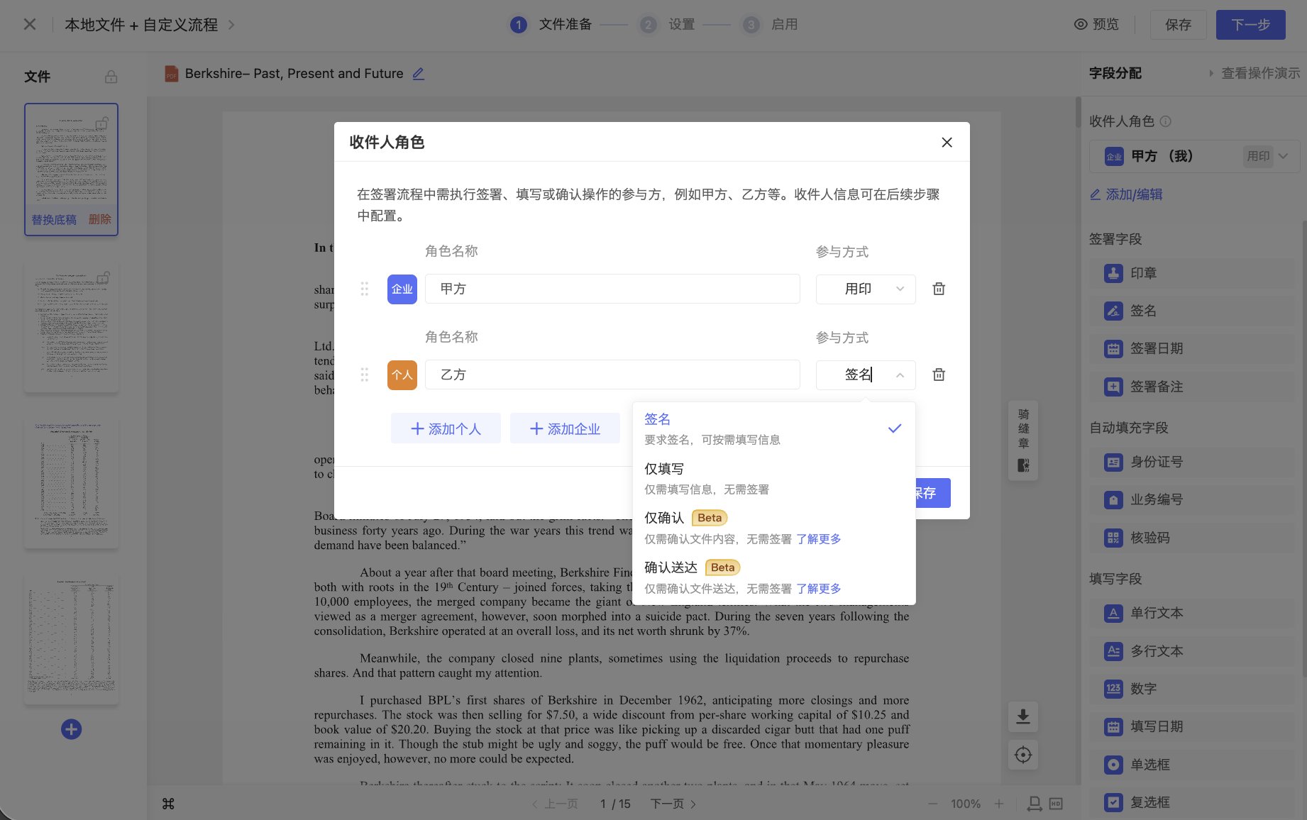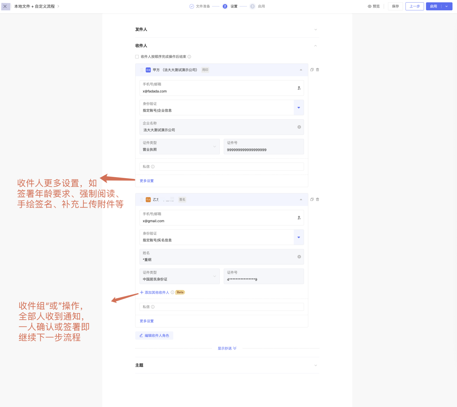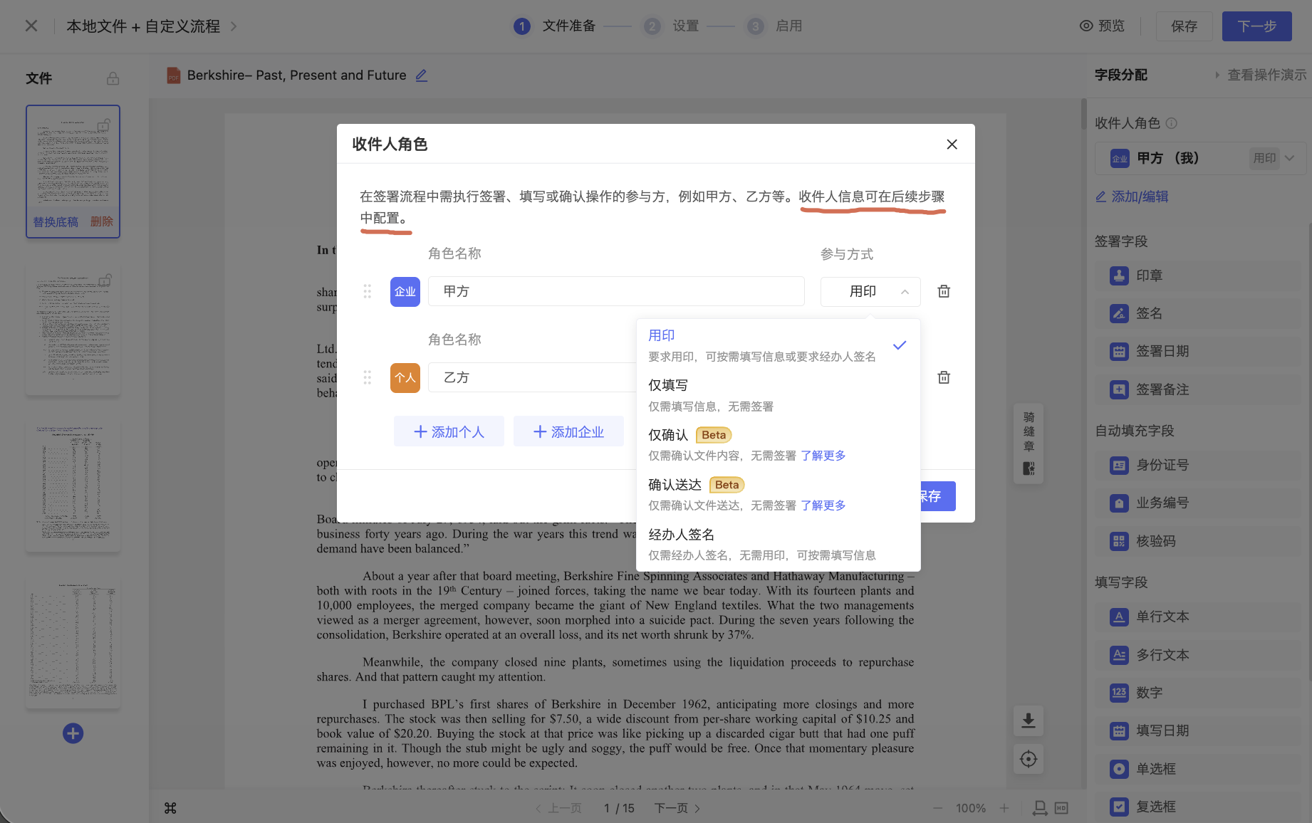 4、添加文件的收件人(参与方)角色与参与方式,如甲方(用印)、乙方(签名):
