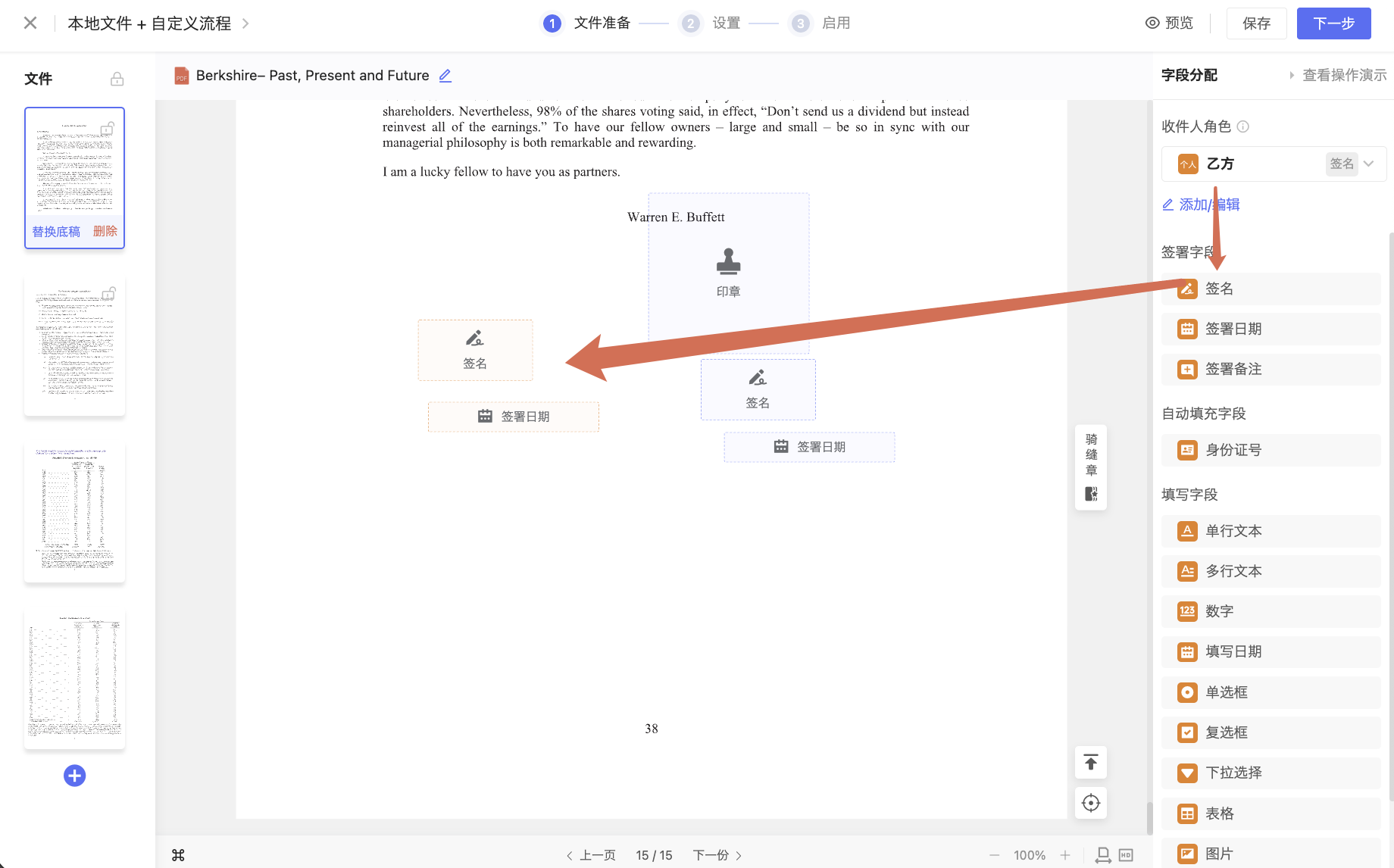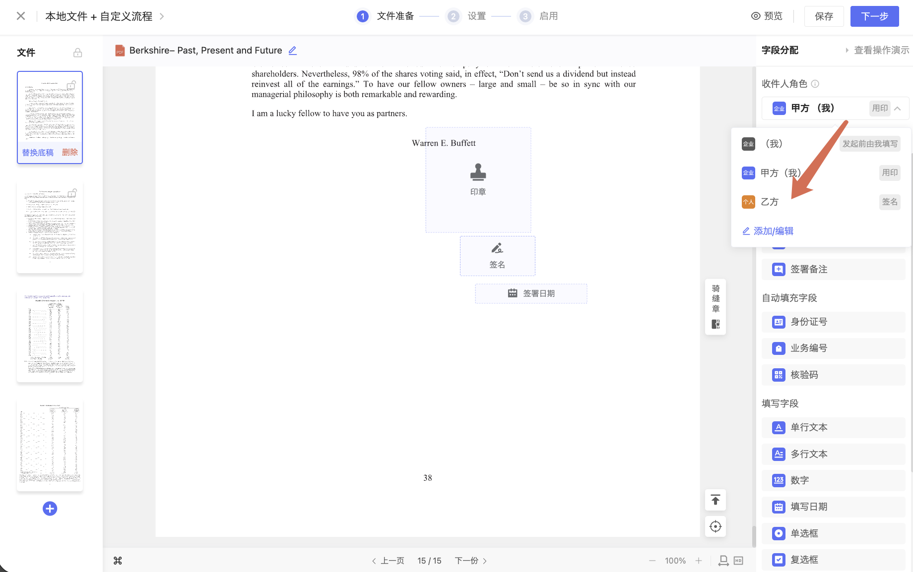5、分别给不同的收件人角色(下拉选择)分配填写或签章位置,确认后点击下一步: