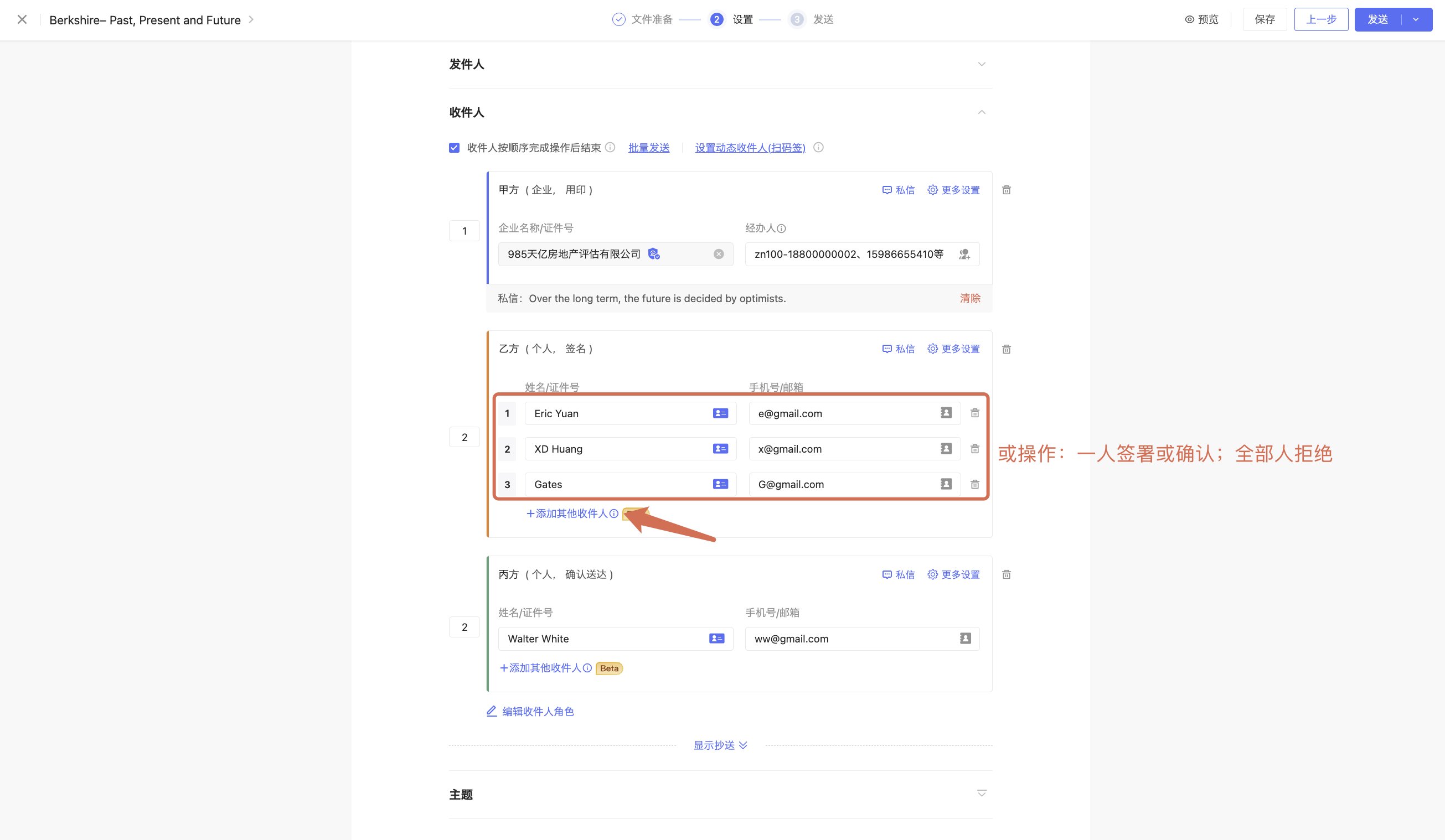 仅支持收件组(个人)或操作:一人签署或确认即继续后续流程,全部人拒绝后流程终止。