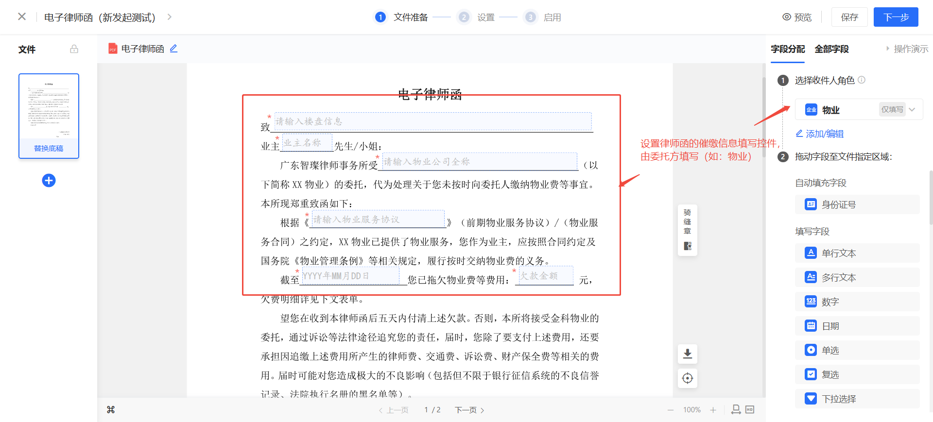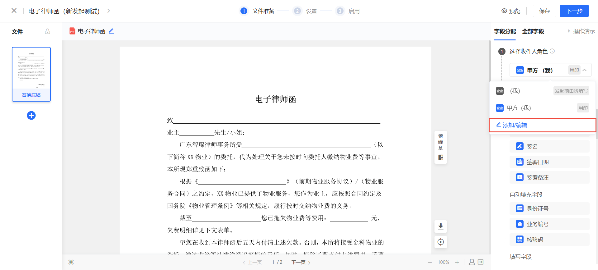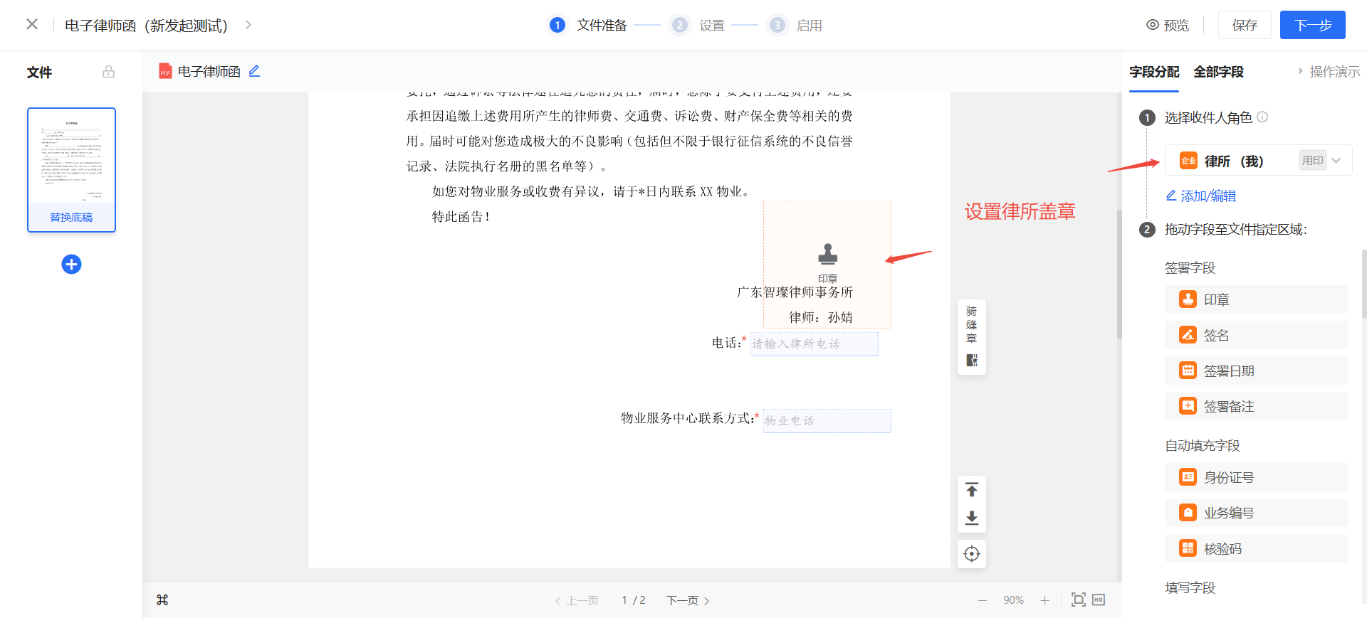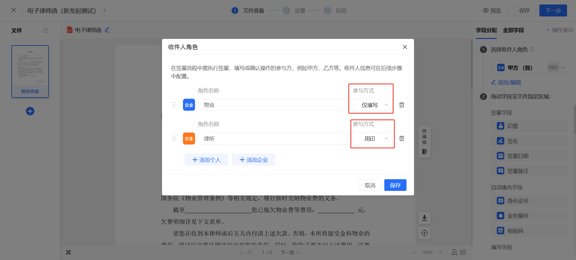 (3)设置签约参与方:以物业公司发送,律所盖章为例: