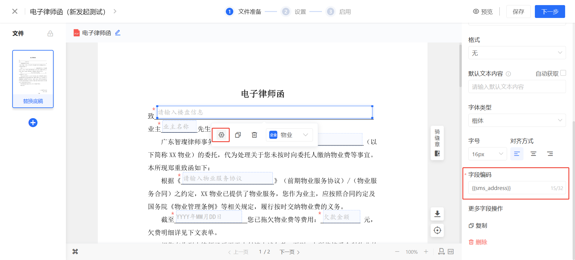 标红处若要动态取律师函中“业主楼栋门牌”的信息,则需要短信中设置{{sms_address}},模板控件的“控件编码”设置为sms_address