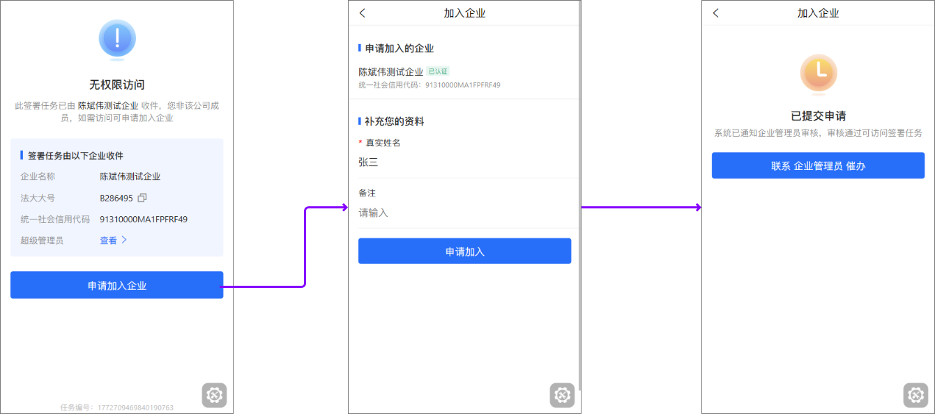 设置自动添加经办人后,我方收到的的签署任务,若指定的经办人(联系方式对应的账号)未加入企业,则自动添加指定的经办人加入任务