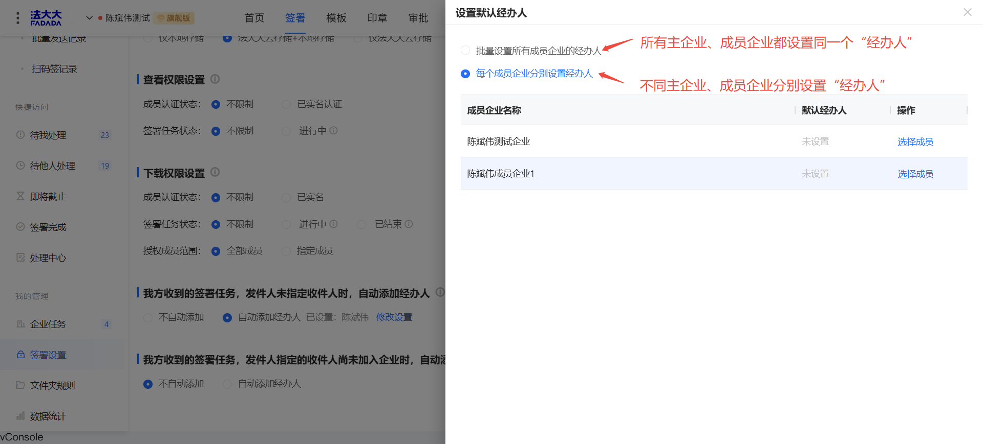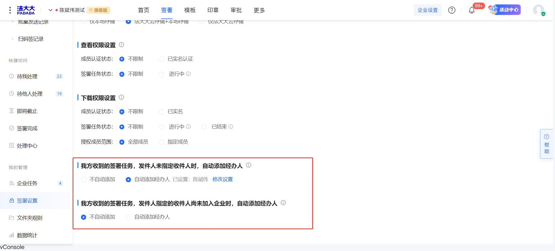 (4)“我方收到的签署任务,发件人指定的收件人尚未加入企业时,自动添加经办人”