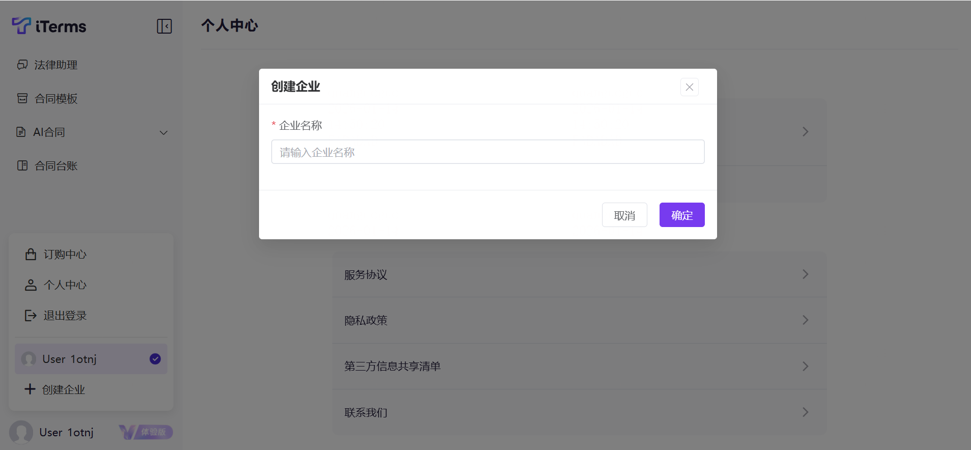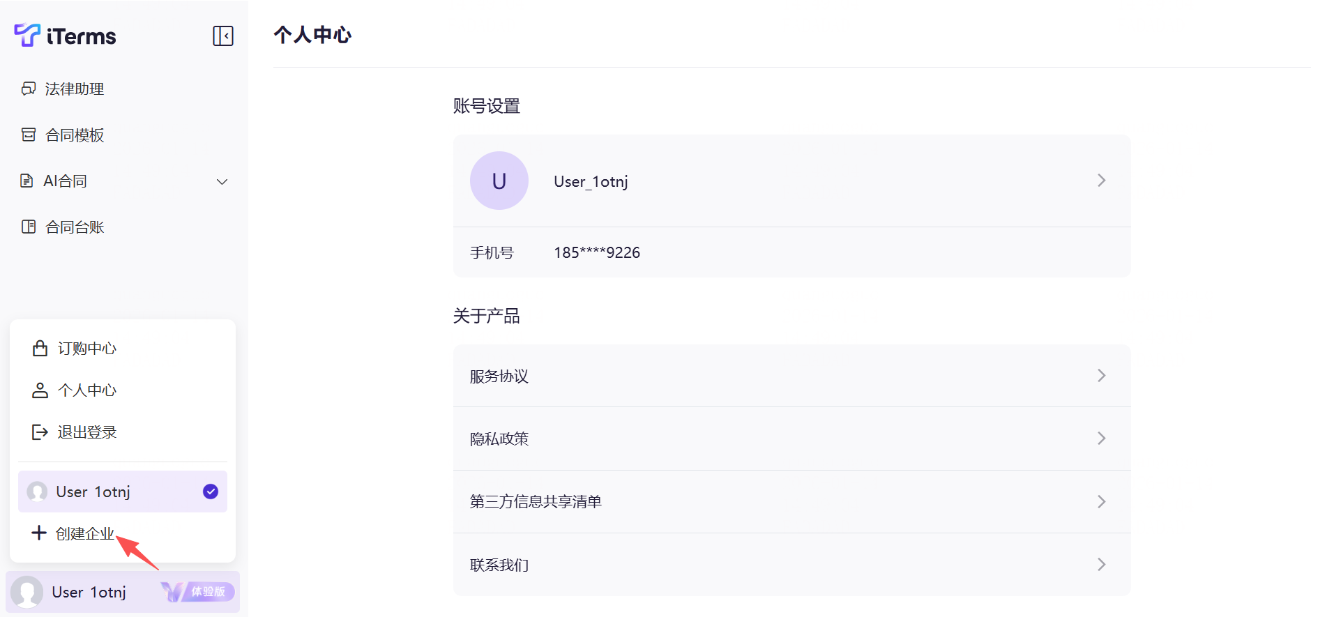 操作:登录后,点击工作台左下角的账号信息,展开后点击“创建企业”(默认创建企业的用户就是企业管理员),填写企业名称。
