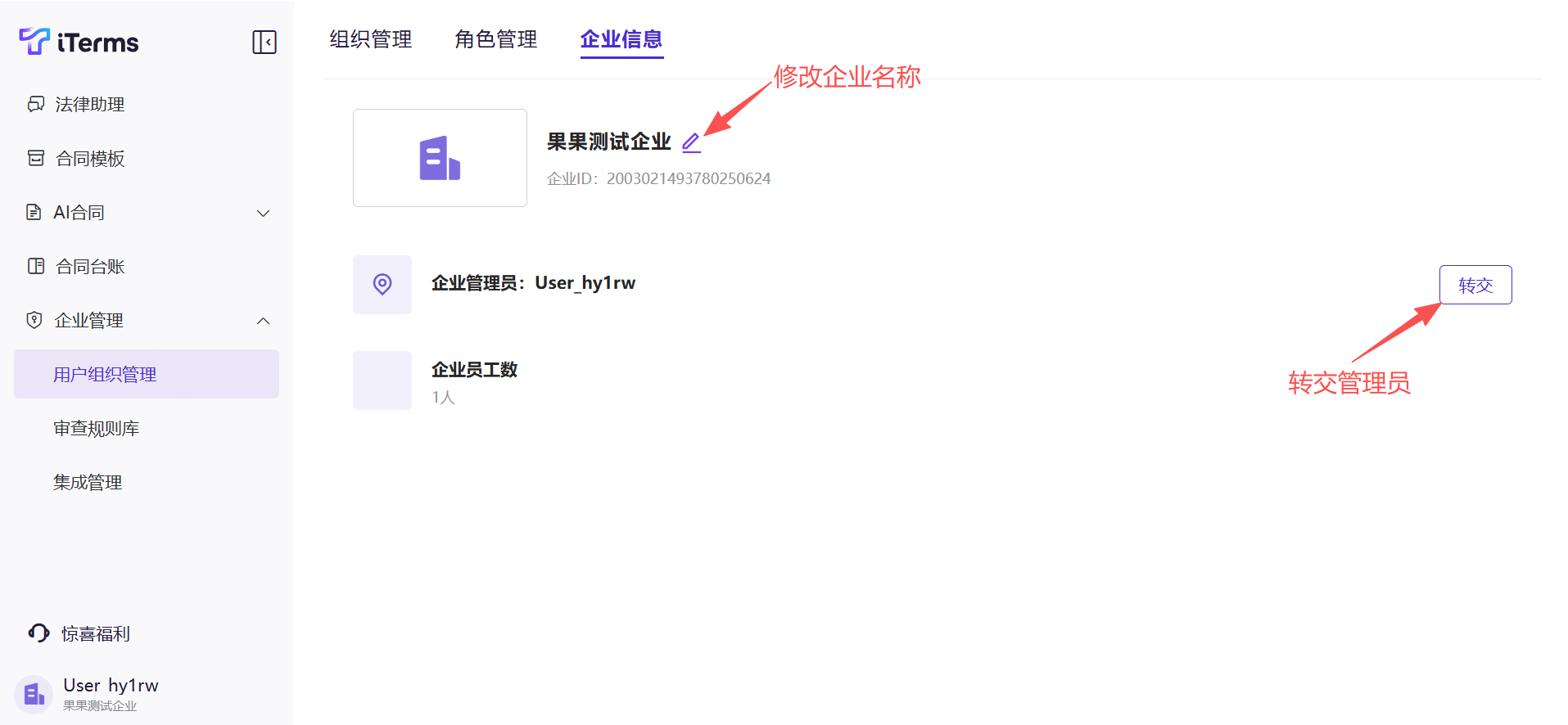 操作:点击侧边栏的的“企业管理”,切换至“企业信息”,可修改企业名称、转交管理员、查看企业员工数。