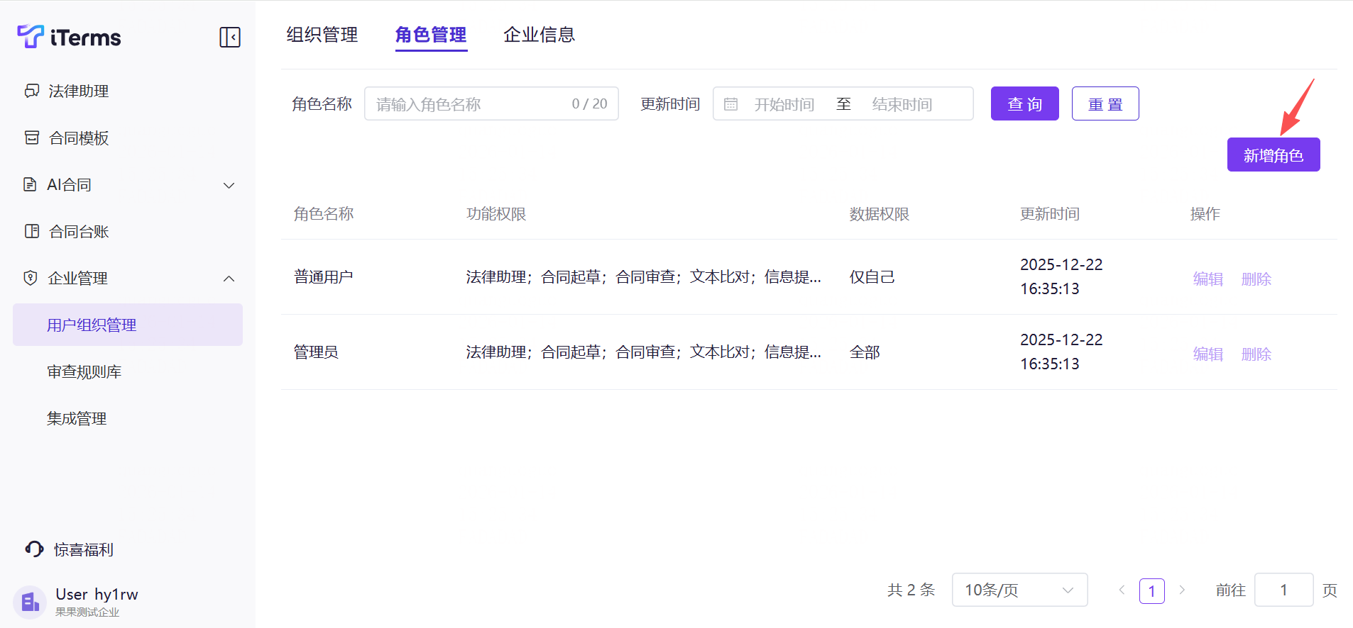 操作:点击侧边栏的的“企业管理”,切换至“角色管理”;新增角色(如管理员、法务、业务人员),输入角色名称并勾选权限(包含功能权限与数据权限)。