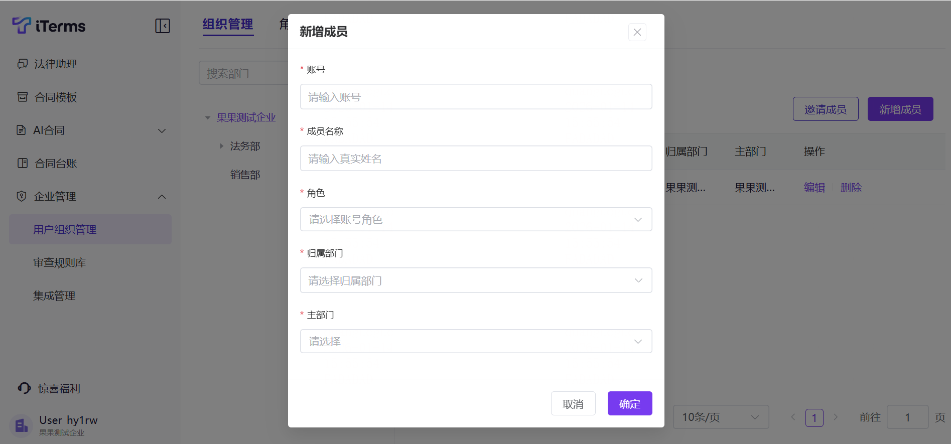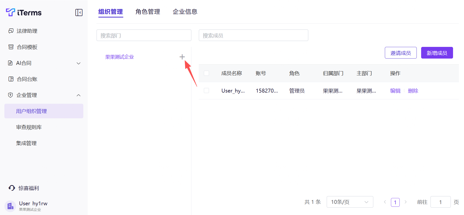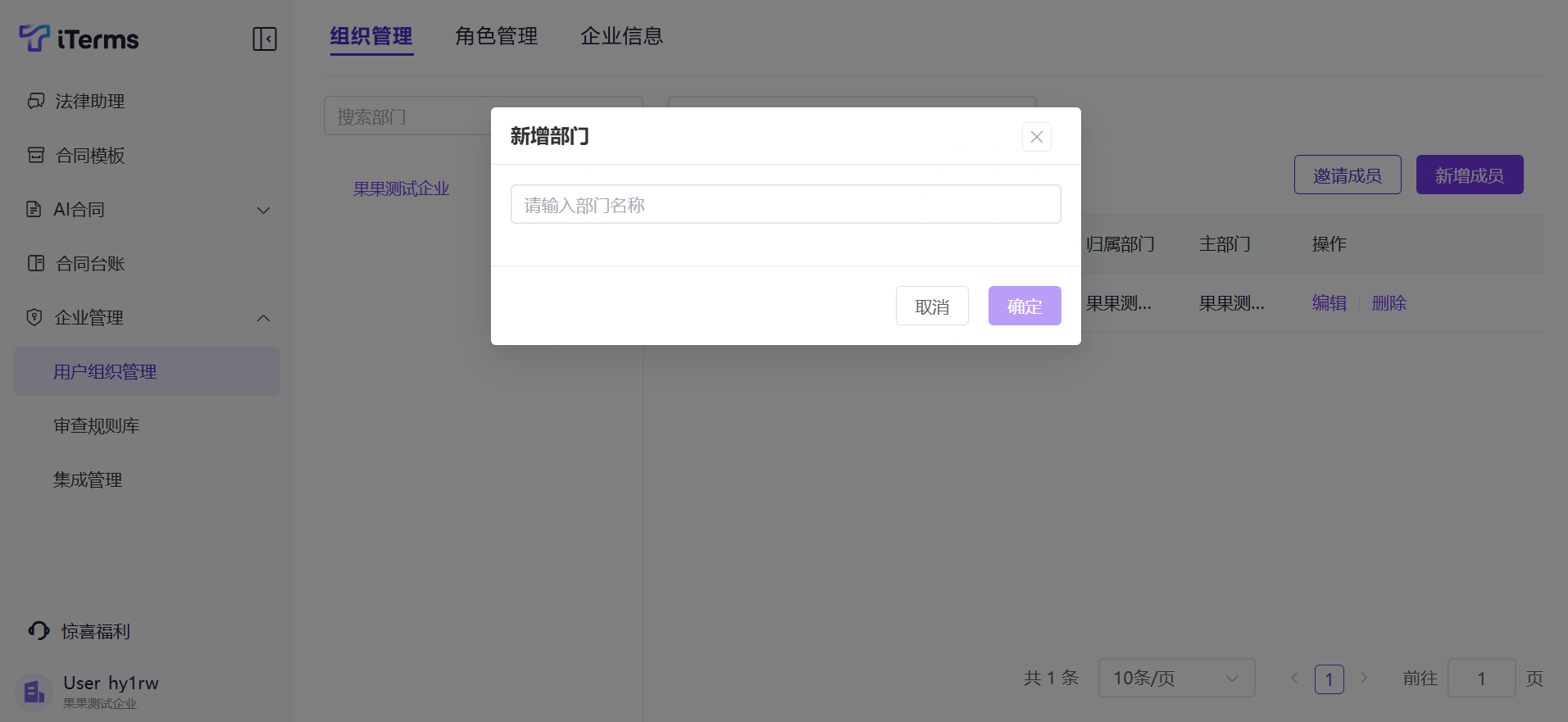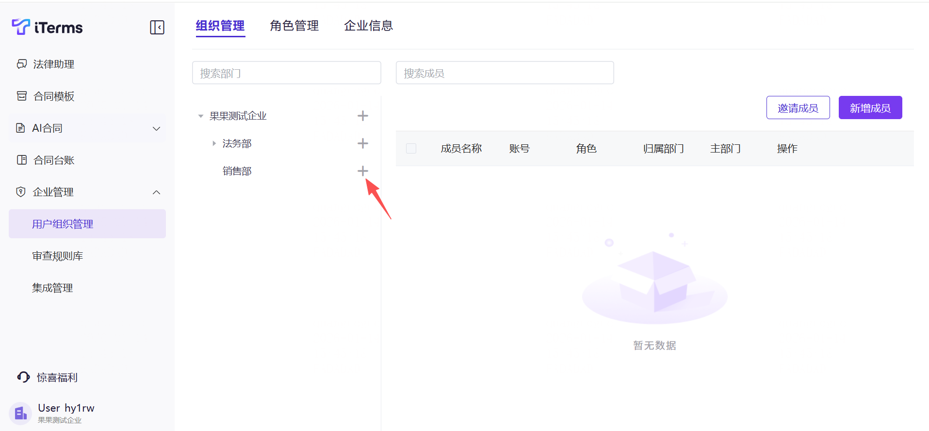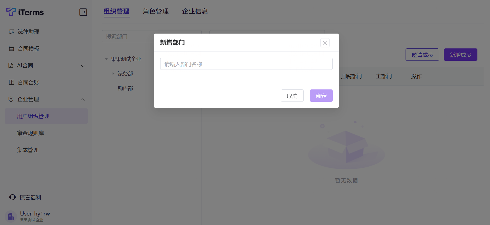 操作:点击侧边栏的的“企业管理”,切换至“组织管理”,新增一级部门(如法务部、销售部等),输入部门名称;