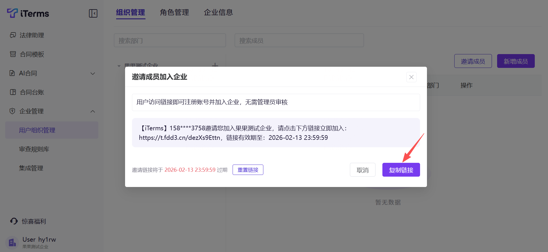 操作:邀请成员,点击"邀请成员",复制链接(有效期30天)发送给被邀请方即可。