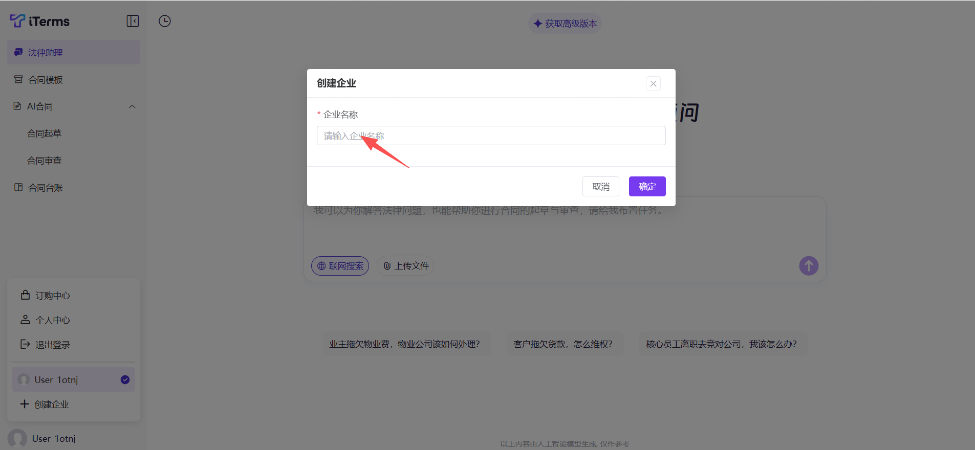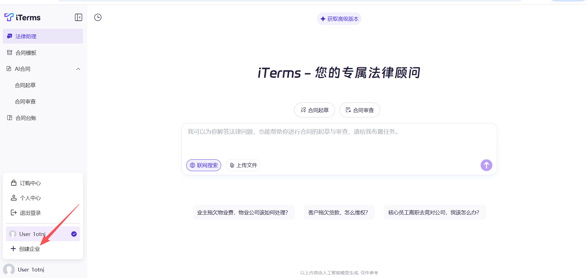 1)点击工作台左下角的账号信息,展开后点击“创建企业”(默认创建企业的用户就是企业管理员),填写企业名称。