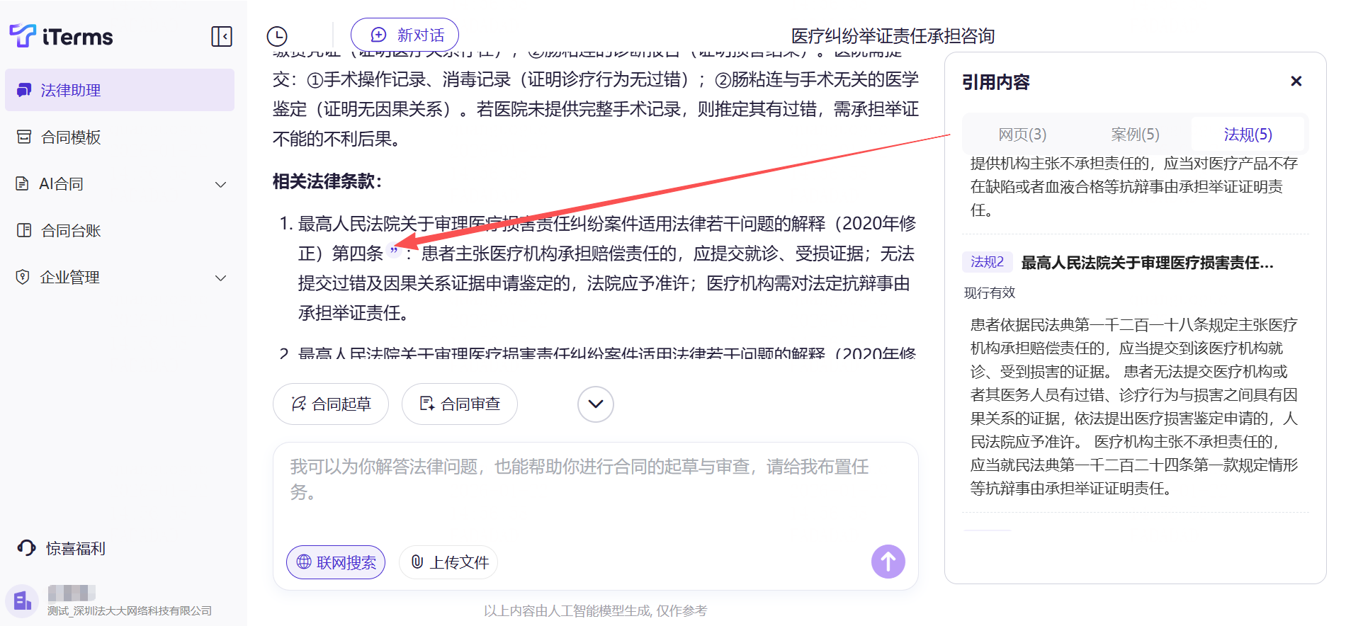 2) 在回复正文中,可以点选法律法规、案例、实务文章后面的 ” 符号,即可在右侧查看到详细的法律内容。