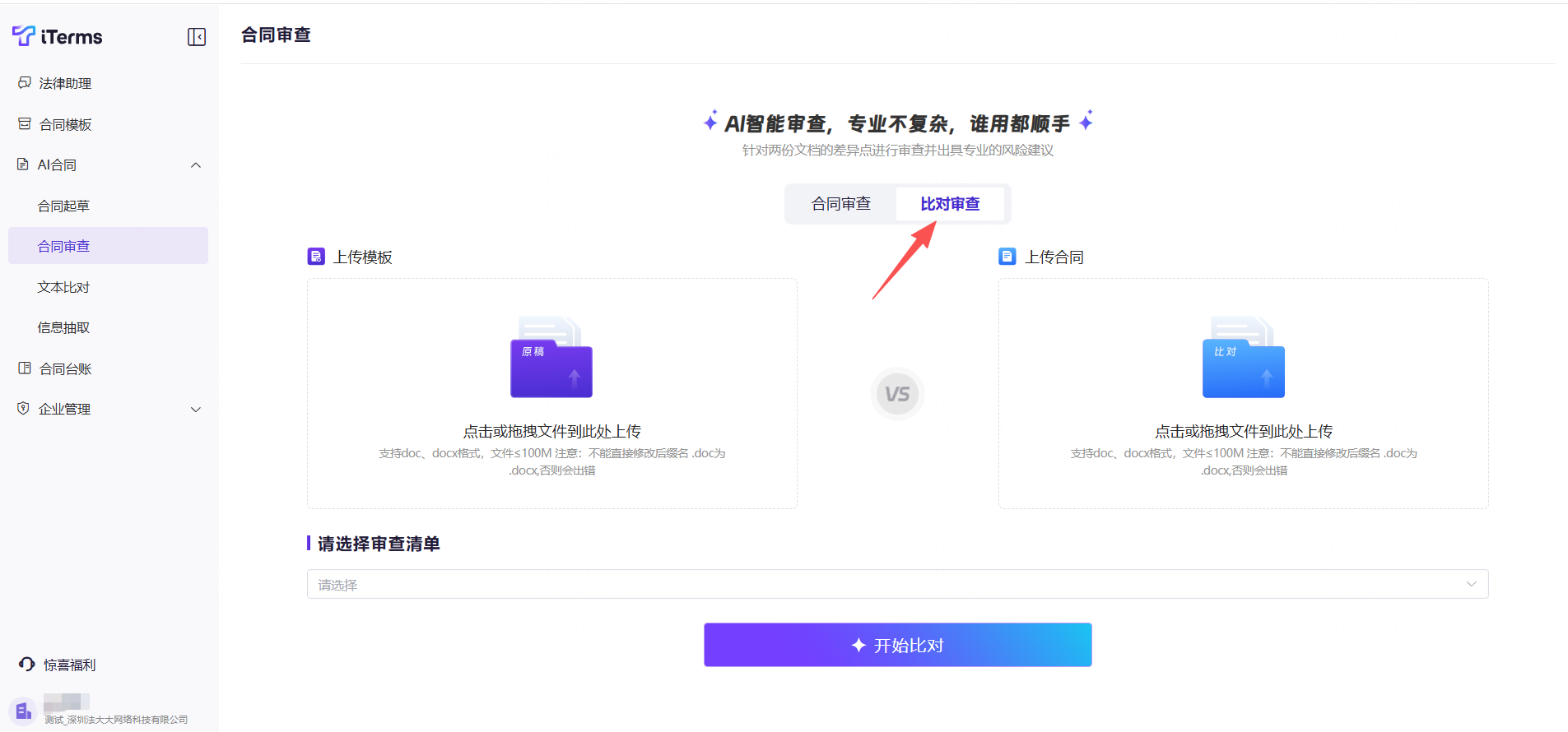 1)在左侧导航栏点击【合同审查】,切换至【比对审查】界面;左侧上传原始的模板文件,右侧上传基于合同模板形成的送审合同,选择审查清单后,点击开始比对。
