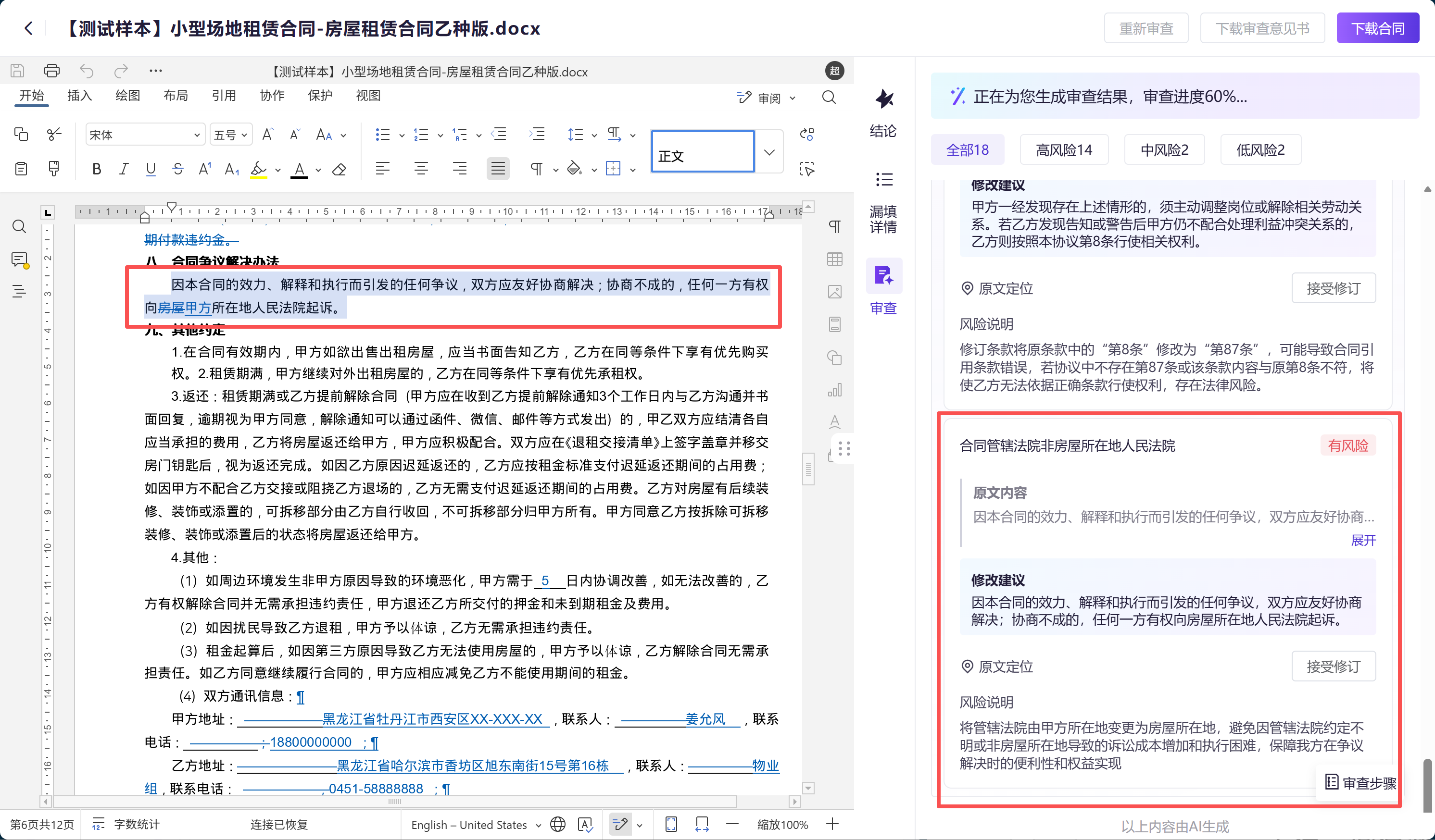 4)合同审查:审查送审稿,定位送审稿中存在的合同风险,可通过审查结果在线修订风险条款。