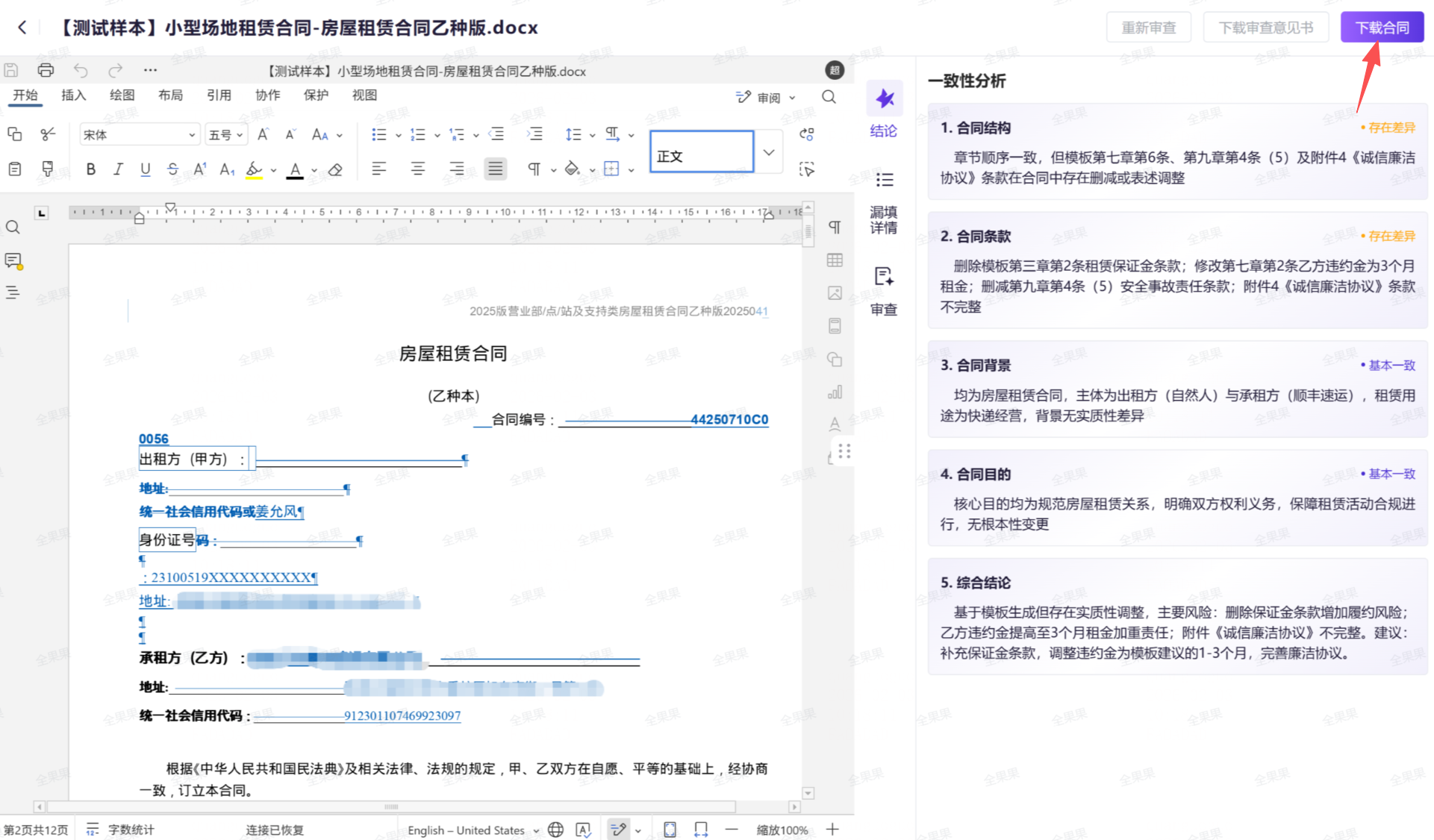 5)下载合同:当您完成比对审查后,则可以点击上方的【下载合同】按钮,将合同的修订版下载到您的电脑本地,进行后续的操作。