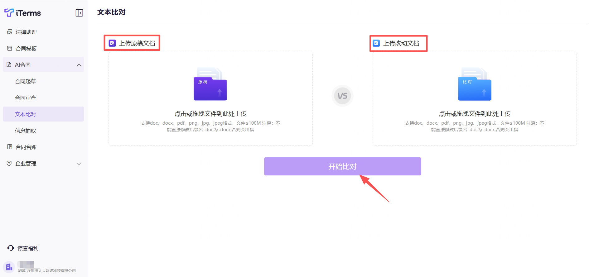 1)在左侧导航栏点击【文本比对】,分别上传原稿文档与改动文档(支持doc、docx、pdf、png、jpg、jpeg格式),上传完成后点击【开始比对】按钮。