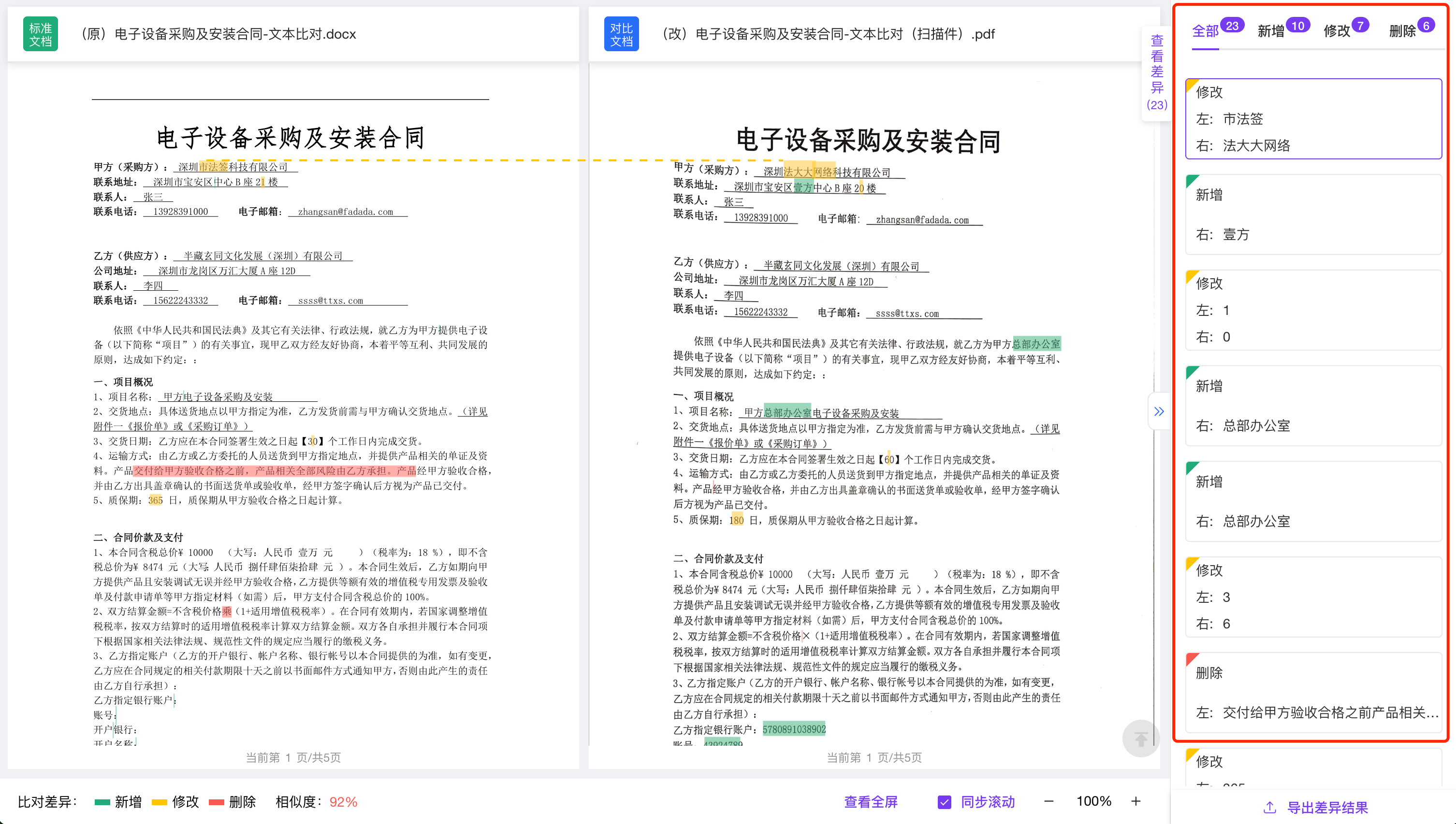 差异高亮: 自动识别并标注“新增”、“修改、”“删除”的内容。