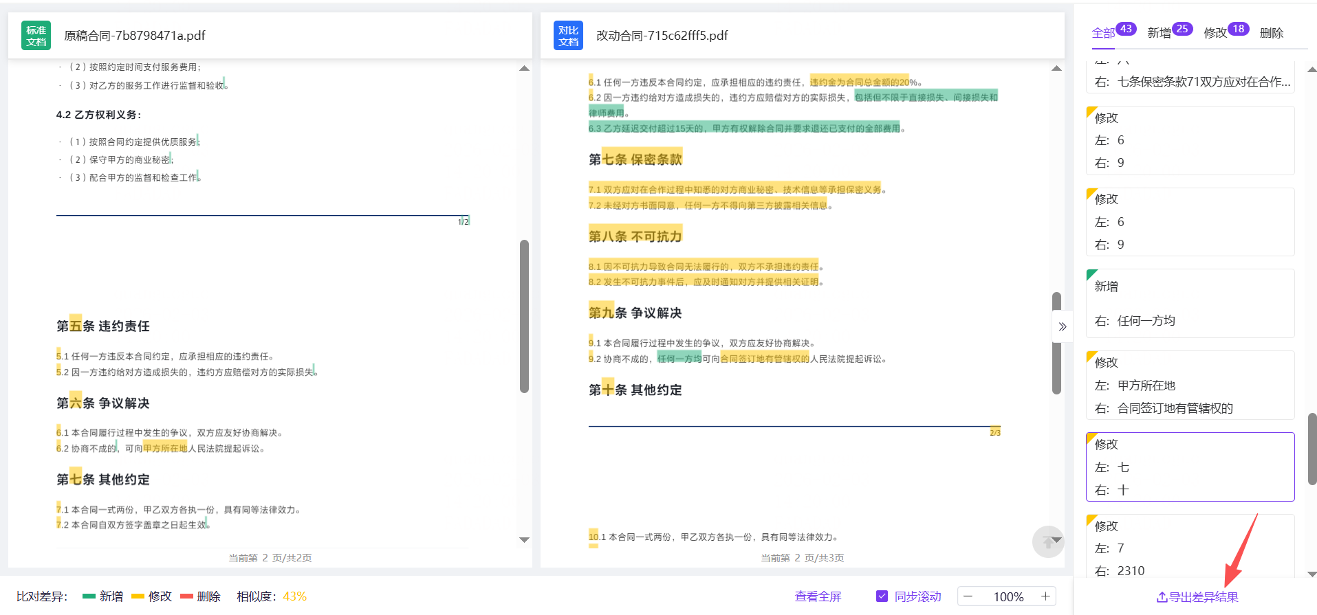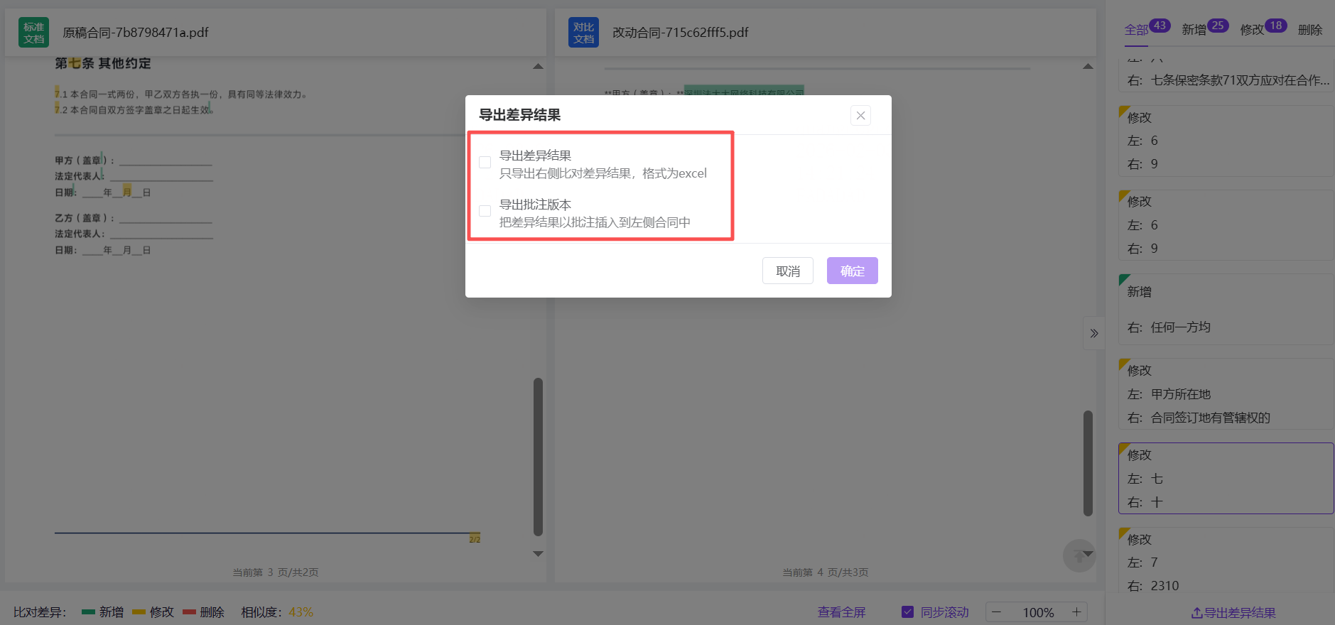 4)导出差异结果:可同时导出差异结果与批注版本。