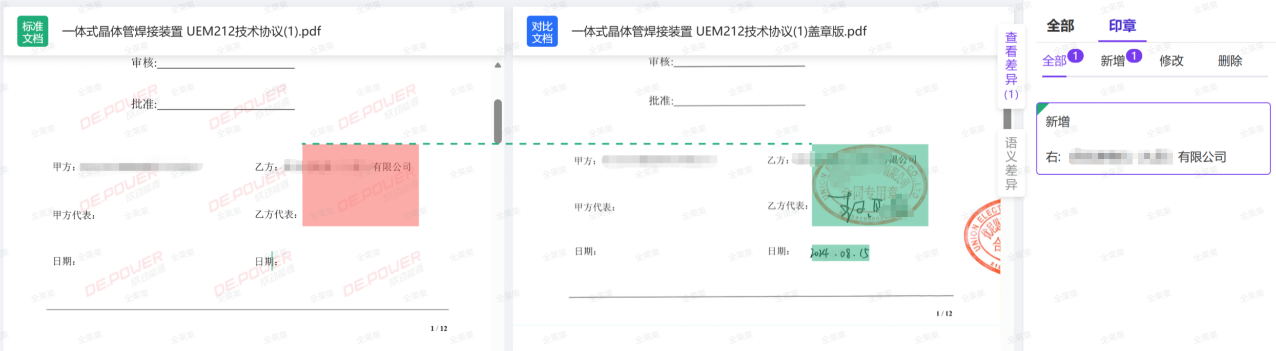 3)印章识别比对、手写体识别比对:可识别出比对版本的印章和手写体的增、删、改情况。
