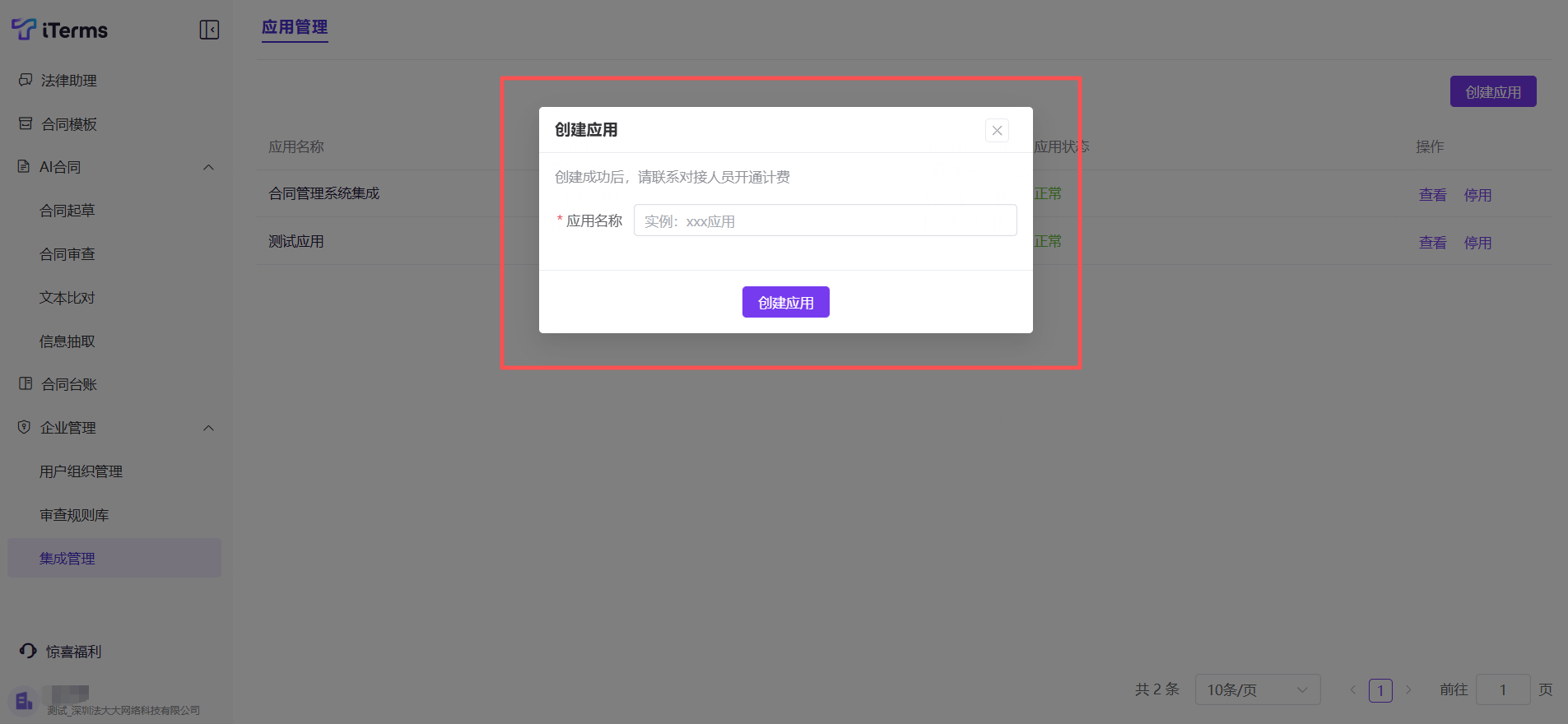 1)创建集成应用:点击右上方的【创建应用】按钮,输入应用名称后即可完成创建,创建完成后需联系对接人员开通计费。