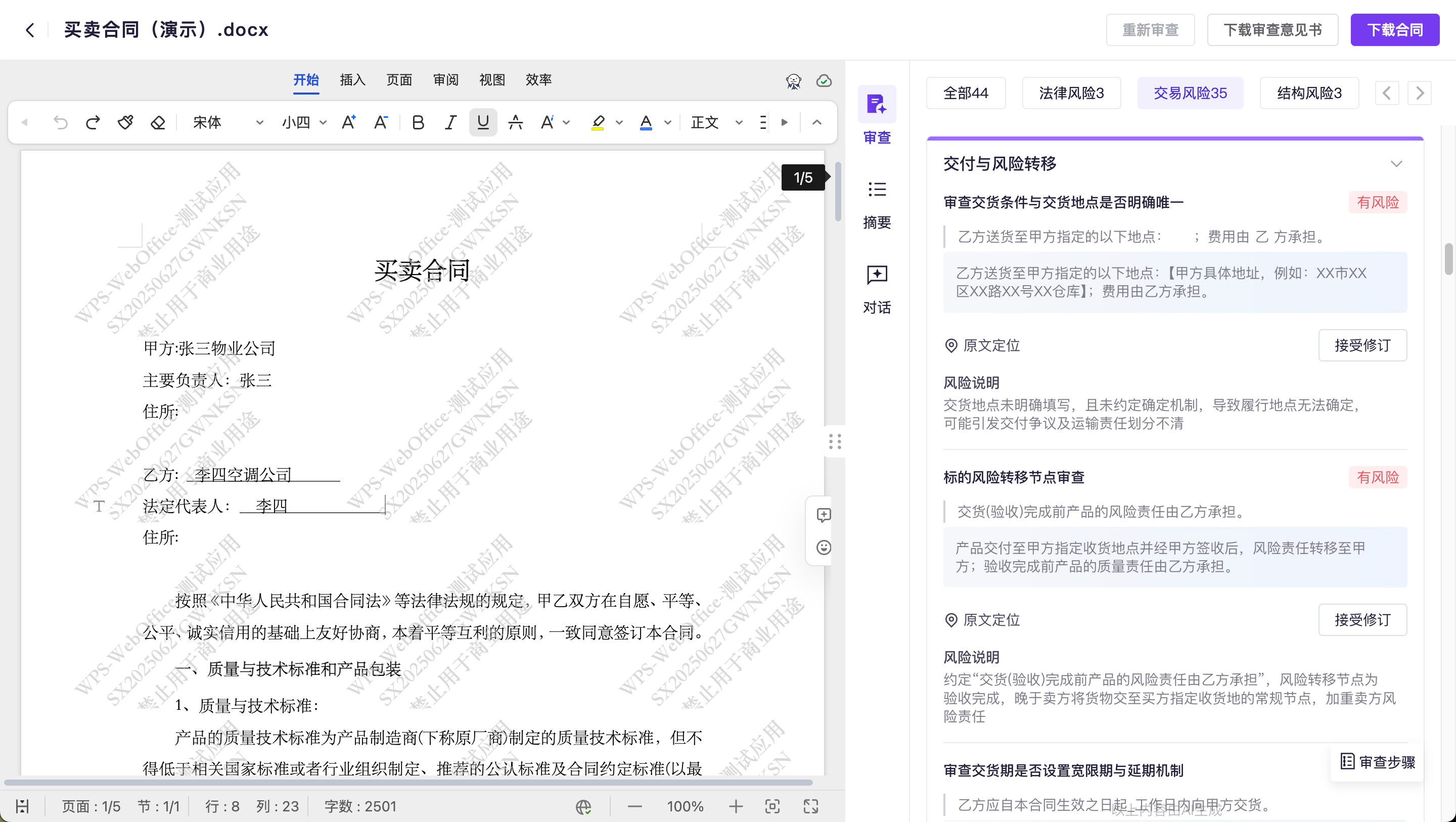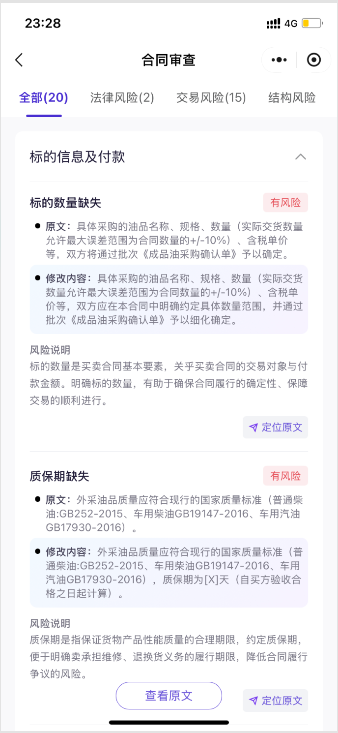 1)提升条款提取、风险判断、修改建议的准确率,支持缺失性、交易性、一致性等风险审查。