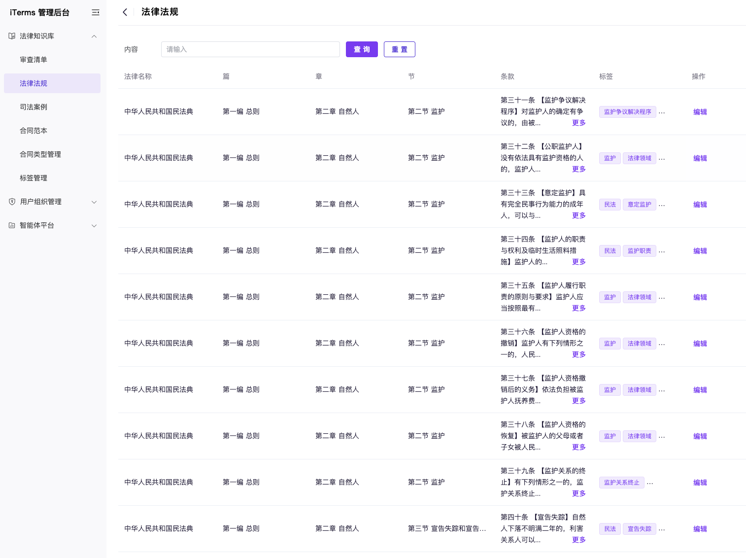1)法律法规:将每一条法律法规拆解成清晰的章节和条款,通过AI标签+条款向量化处理的方式,来提升法律问答检索法规的匹配性。