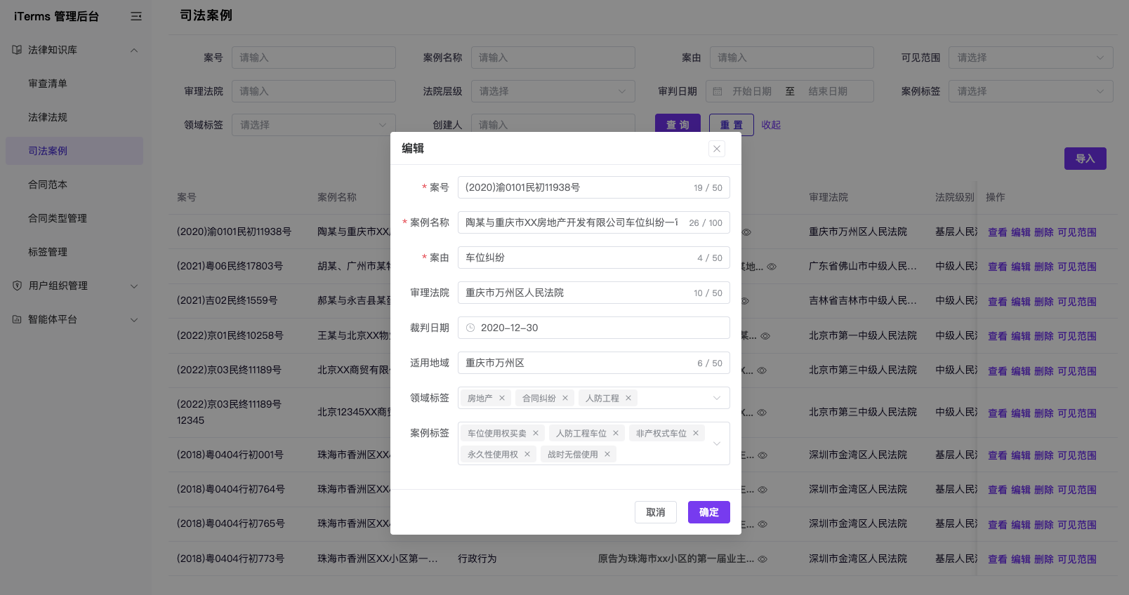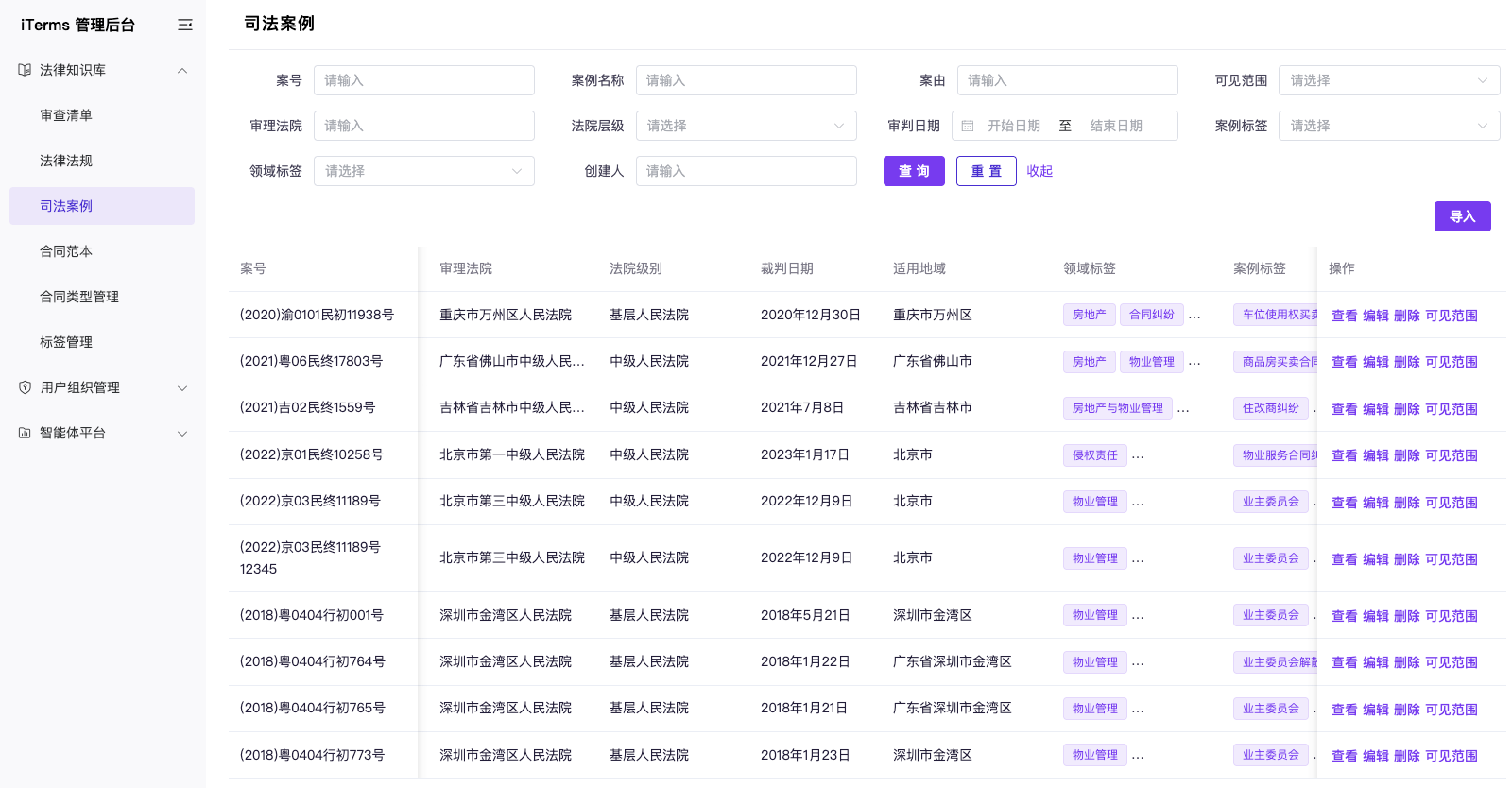 法律知识库 | 法律知识库用于管理法律法规、司法案例、审查清单、合同范本等核心数据。通过精细化的标签管理,将零散的法律信息构建成一个结构化、可调用的知识体系,为合同审查、起草、问答提供数据支撑 |