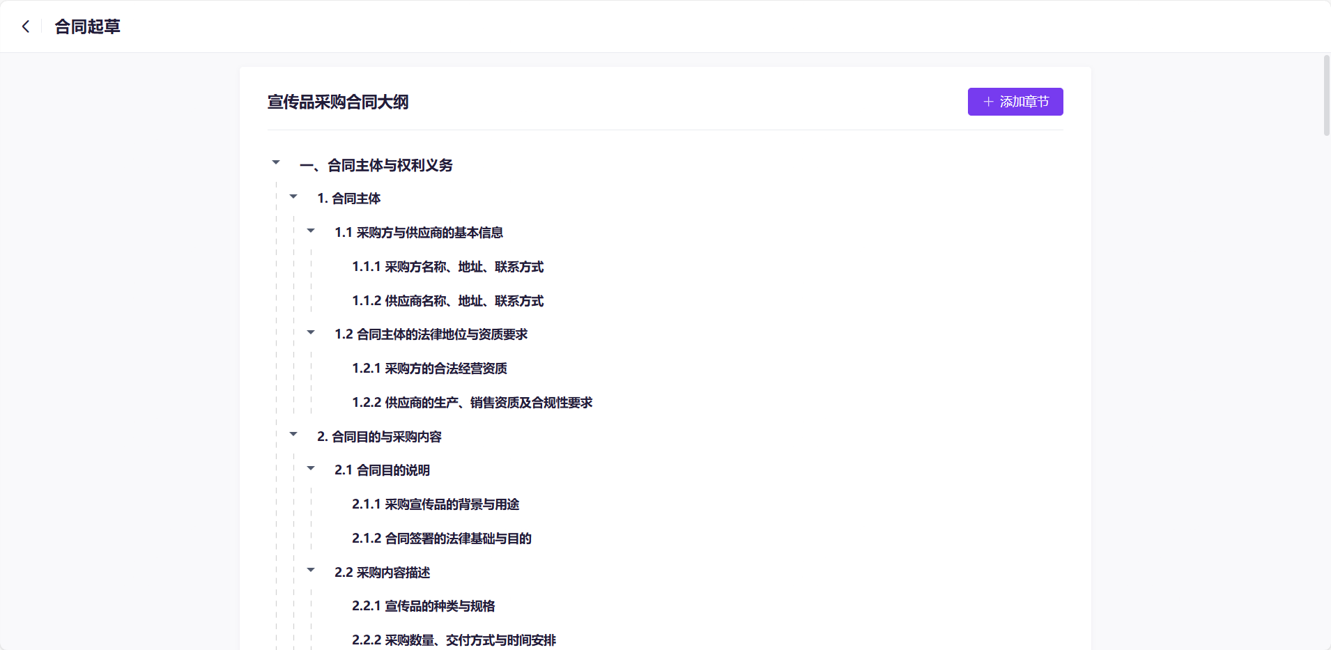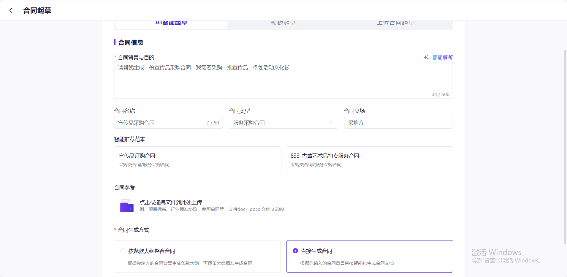 通过输入合同背景与目的,智能解析出基本信息(合同名称、合同类型和合同立场),并智能推荐合同范本。同时,允许上传合同参照,例如项目标书、行政标准文件、行业标准协议等,作为模型生成合同的参照物。而后,合同生成方式有两种,一是“按条框大纲起草”,根据所填合同基本信息生成合同条款大纲,并支持用户直接调整大纲,更精准得生成合同;二是"直接生成合同",根据所填合同基本信息,直接生成合同。