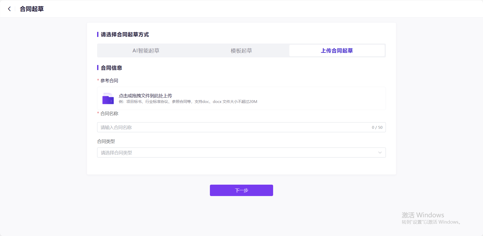 上传合同起草 | 通过上传本地合同文件的方式进行起草,便捷、专注于已有合同草稿,并且可快速发起智能审查。 |