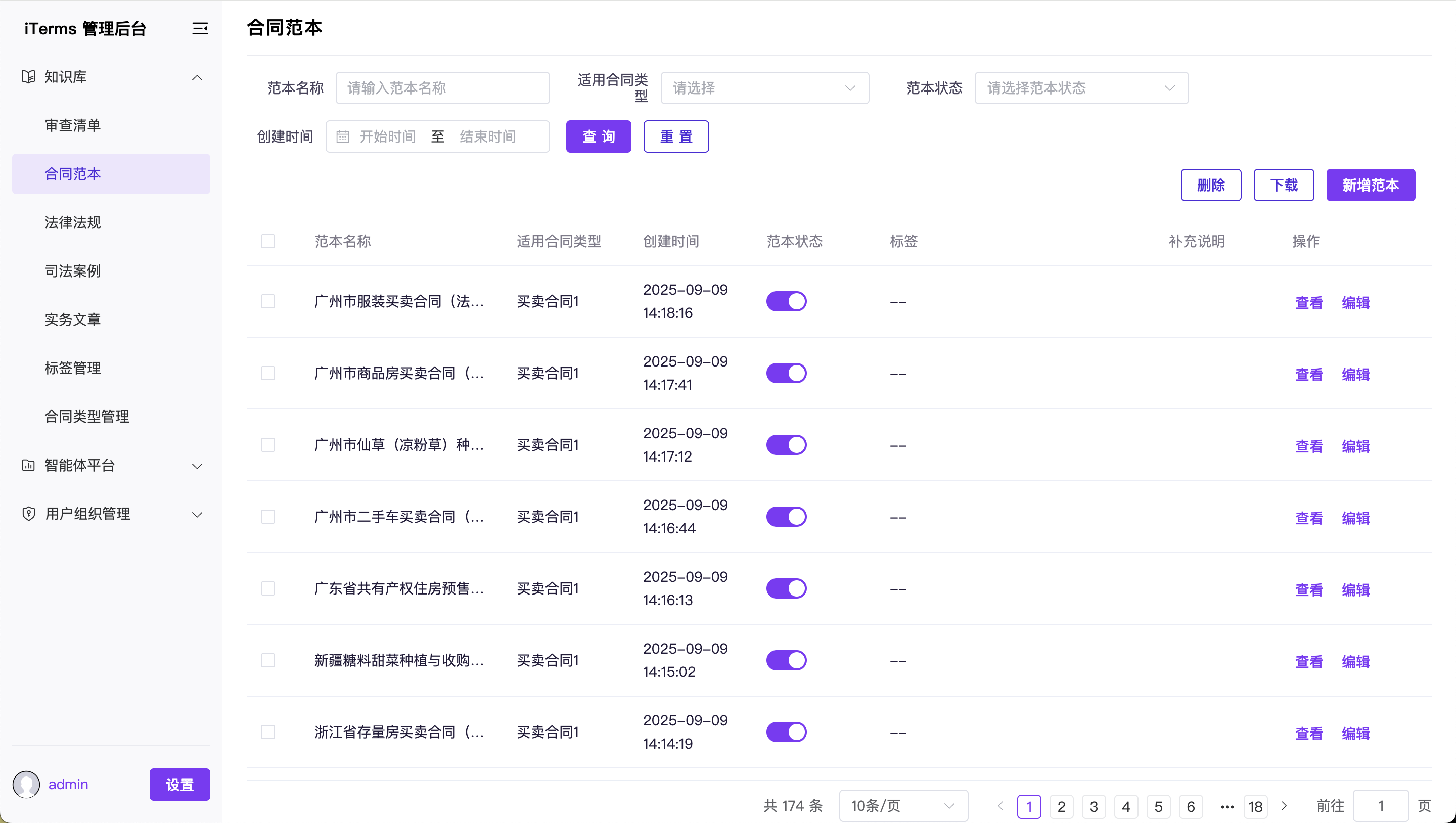范本库模块,支持在管理后台上传并管理合同范本。而且,合同范本作为核心数据资产,支持用户在进行合同起草时,作为推荐模板选用。